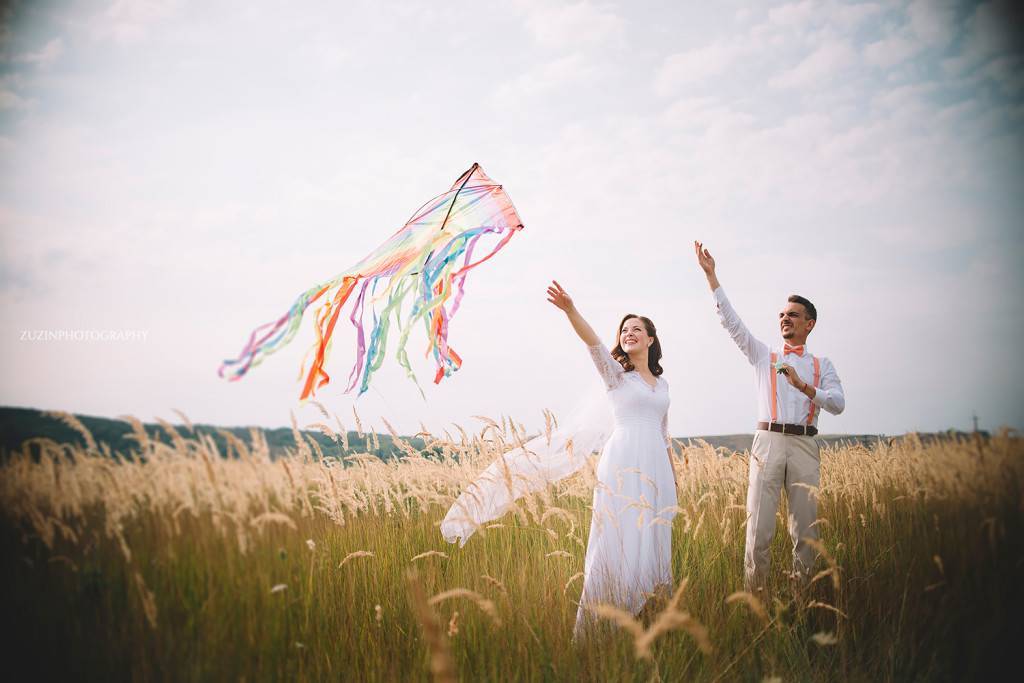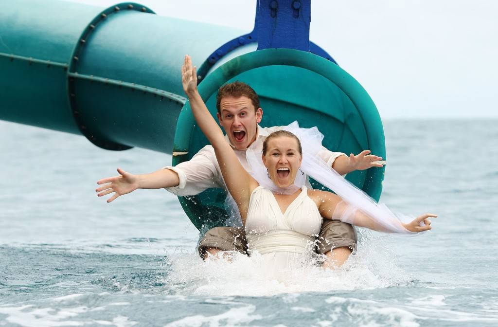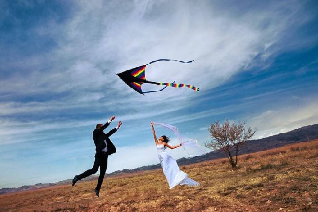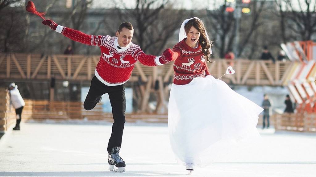 Такая съемка может быть выполнена в стиле «прощай детство». Что позволит молодоженам подурачиться и поиграть. Хорошо будет, если вы закажете фотосессию во второй половине дня. Тогда сможете получить красивые снимки в мягком вечернем освещении. А когда совсем стемнеет, сфотографироваться в свете разноцветных лампочек.