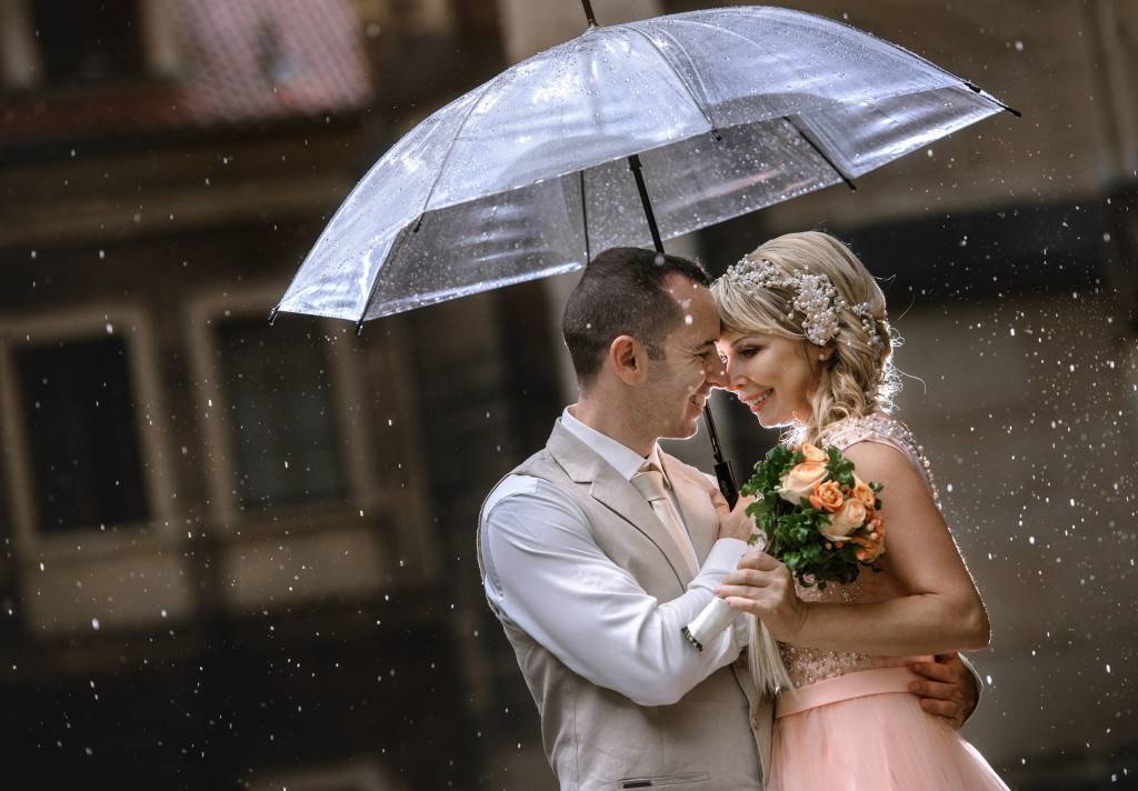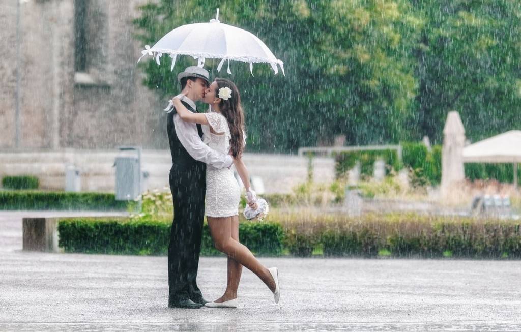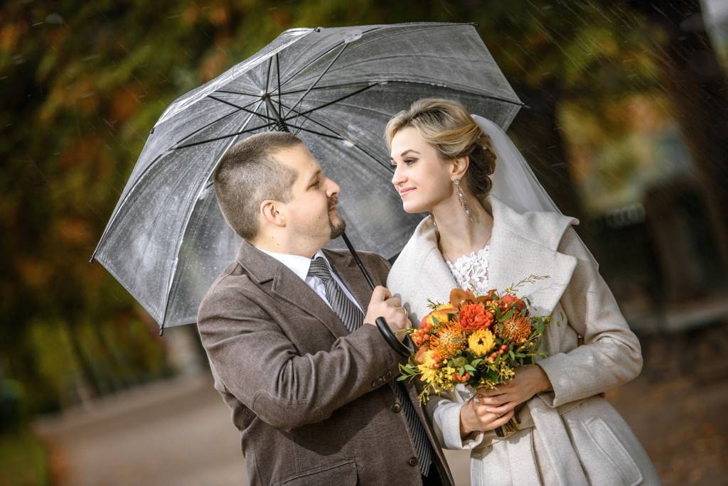 Еще одно преимущество свадьбы в дождь – фотосессия с зонтом.