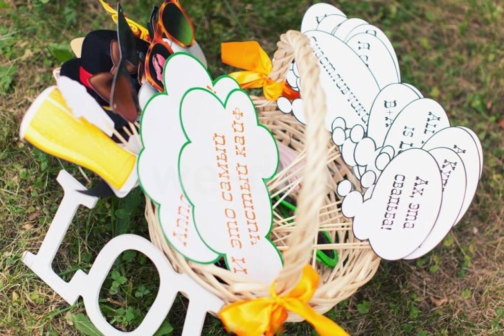 - Гости должны быть оповещены о местонахождении фотозоны заранее, тем более, если она находится где-то на природе неподалеку. Для этого лучше всего подойдут указатели с табличками, на которых будет указано направление. Причем желательно сделать их достаточно яркими и заметными. Таким образом, молодоженам не придется волноваться, что кто-то пропустил объявление.