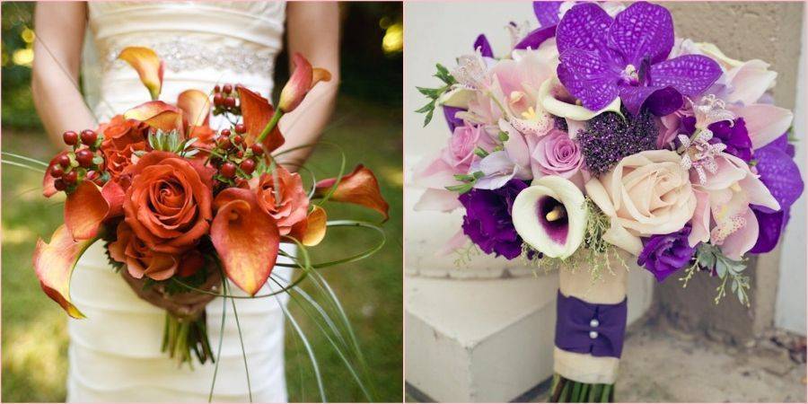 В качестве одного из главных компонентов цветочной композиции для свадебной церемонии эти цветы встречаются чаще, чем в варианте соло. Для букета невесты из калл и орхидей оптимальным решением будут экземпляры растений в белой тональности, а подчеркивать их красоту и благородство оттенка лучше всего листьями зеленого цвета. Тогда свадебная композиция не сольется с нарядом, а только подчеркнет изысканность и чистоту подвенечного платья.