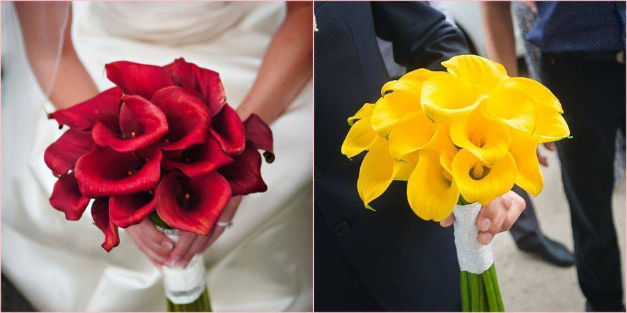 Каллы бывают разных цветов, вы сможете подобрать тот оттенок, который максимально подходит под ваш наряд и макияж.