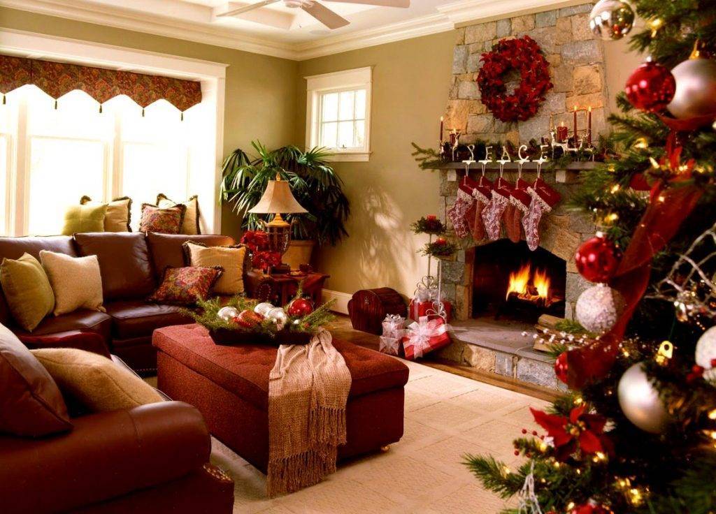 Уютная комната с камином. Камин — это атрибут, который ассоциируется с новогодними праздниками. На камин можно развешать носки для подарков и положить туда цветные леденцы в виде закрученных палочек.