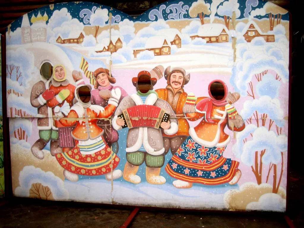 Новогодний баннер. Полотно на деревянном каркасе с изображениями на новогоднюю тематику. Это может быть зимний лес, герои сказок, объёмные надписи. Все зависит от вашей фантазии.