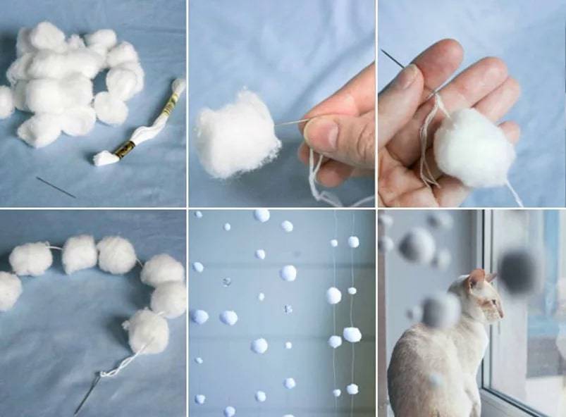 Самый простой вариант обустройства детского пространства для создания красивых фото. Для этого понадобиться вата, фольга и хорошее настроение. Из ваты необходимо соорудить шарики разного размера. Насадить их на шерстяную нить с помощью клеевого пистолета. И каждую нить по отдельности закрепить на потолок с помощью скотча. Аналогичные действия проделать с фольгой. Только из фольги предварительно вырезать круги либо снежинки.