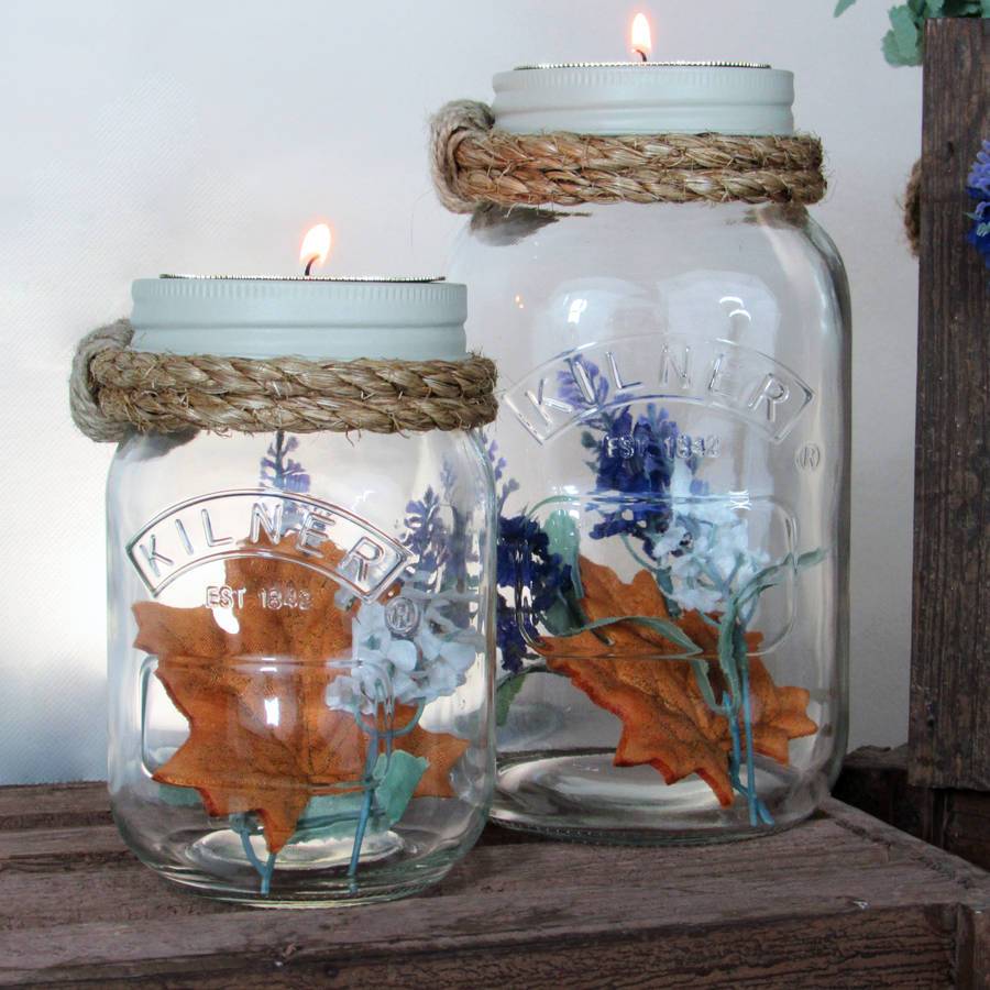 Вся изюминка этой идеи – в количестве. Найдите похожие невысокие баночки, поместите в каждую из них по одной круглой свечке и расставьте по дому в количестве от трех до четырех штук. Получается просто, но со вкусом.