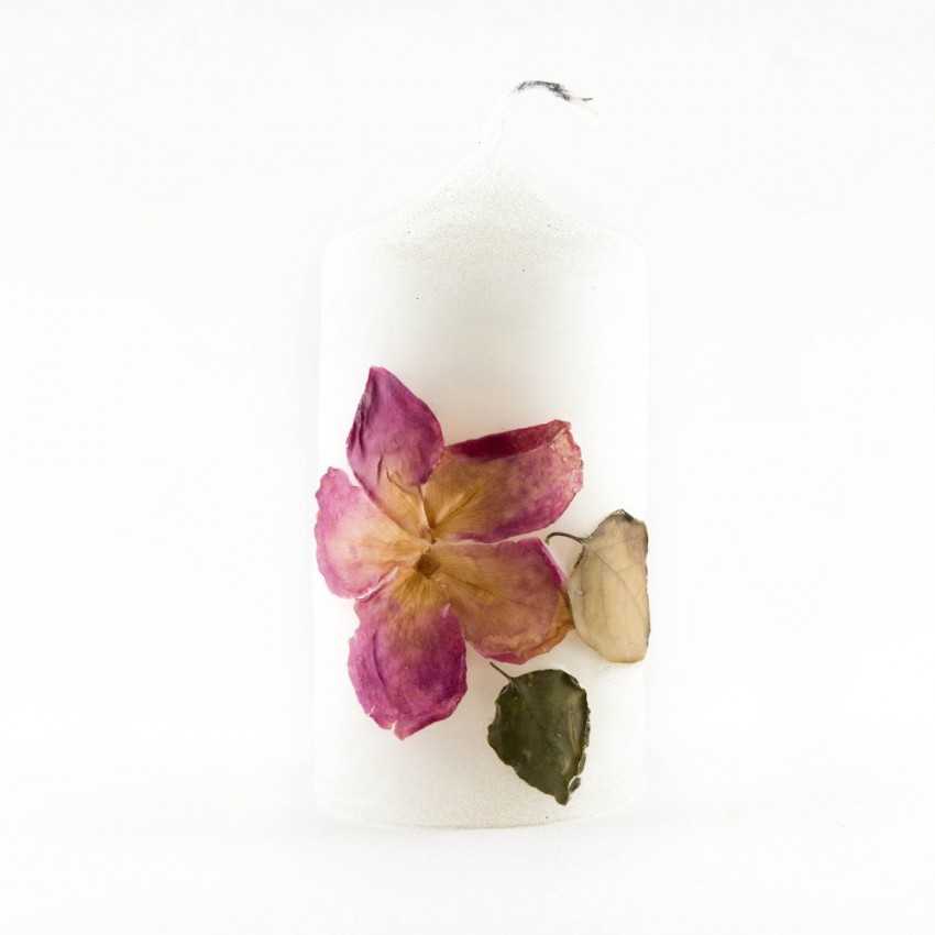 Возьмите другую свечу, порежьте ее на части, удалите фитиль. Растопите парафин, перелейте в другую емкость и окуните в него свечу с цветами.