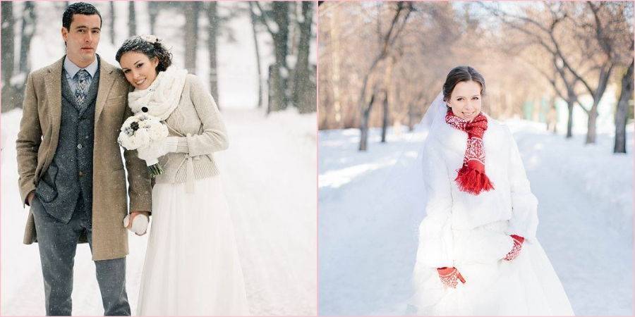 Современные модные тенденции позволяют выбирать верхнюю одежду, в которой вам будет по-настоящему комфортно и тепло. Например, невеста может выбрать тёплый полушубок, стильное пальто или трикотажный кардиган. Ножки можно утеплить модными сапогами, тёплыми валенками или вовсе выбрать современные угги