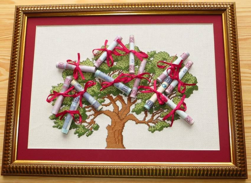 - вышитый ствол денежного дерева с аккуратно закрепленными деньгами;