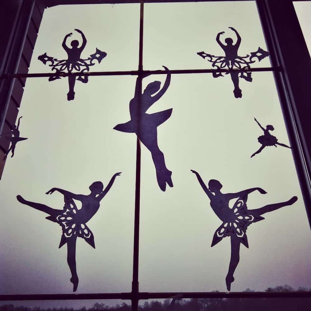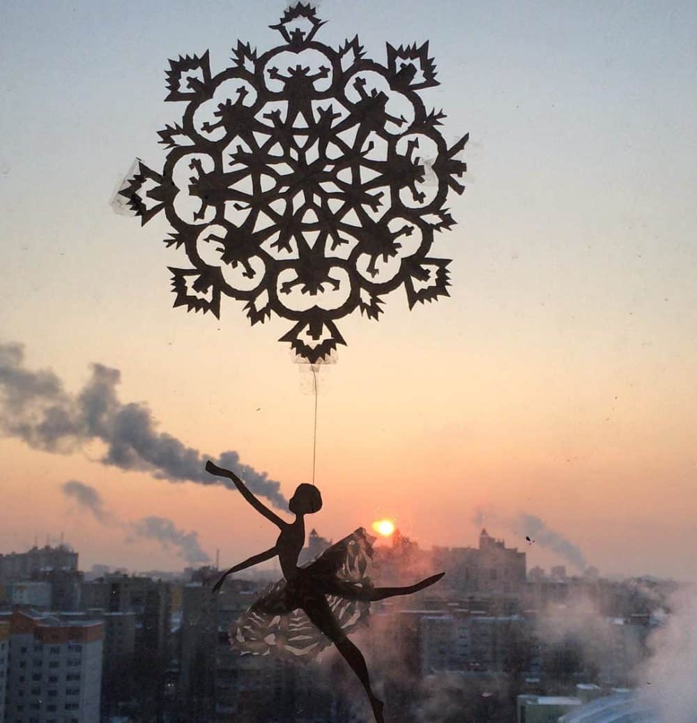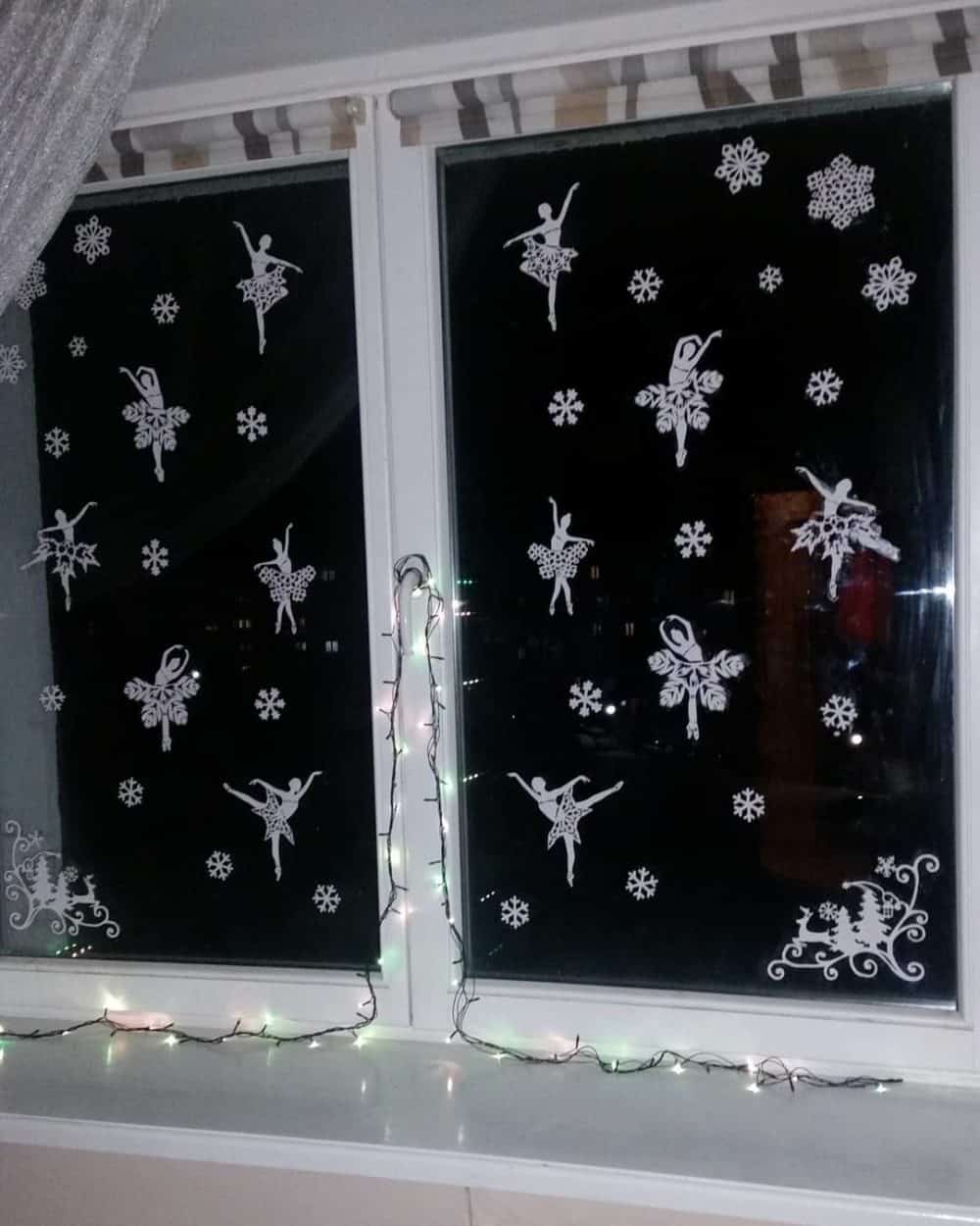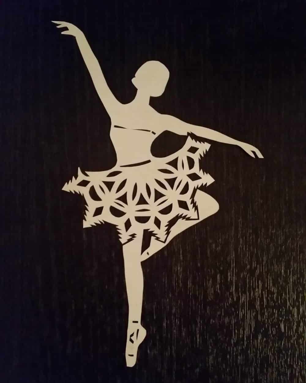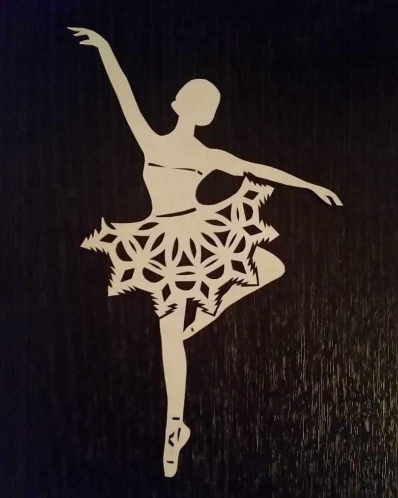 Вытынанка в виде балеринки всегда имеет ажурную юбочку-пачку. Это не только украшает фигурку, но и делает ее воздушнее. Оформление окон в этой технике напоминает морозные узоры, а однотонные снежные балерины хорошо дополняют орнаментальные композиции.