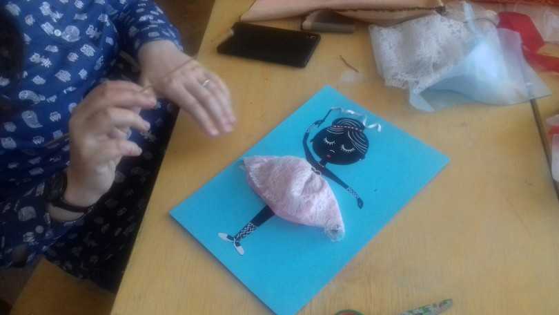 - Юбочка. Ее можно сделать из отреза цветного банта или другой красивой ткани. Край материала нужно стянуть, сшив его или склеив, чтобы юбка получилась воздушной и объемной. Готовую юбку аккуратно приклеить к силуэту балерины, используя клей ПВА или канцелярский. Прижать плотнее и подержать пару минут материал, пока клей не «возьмется».