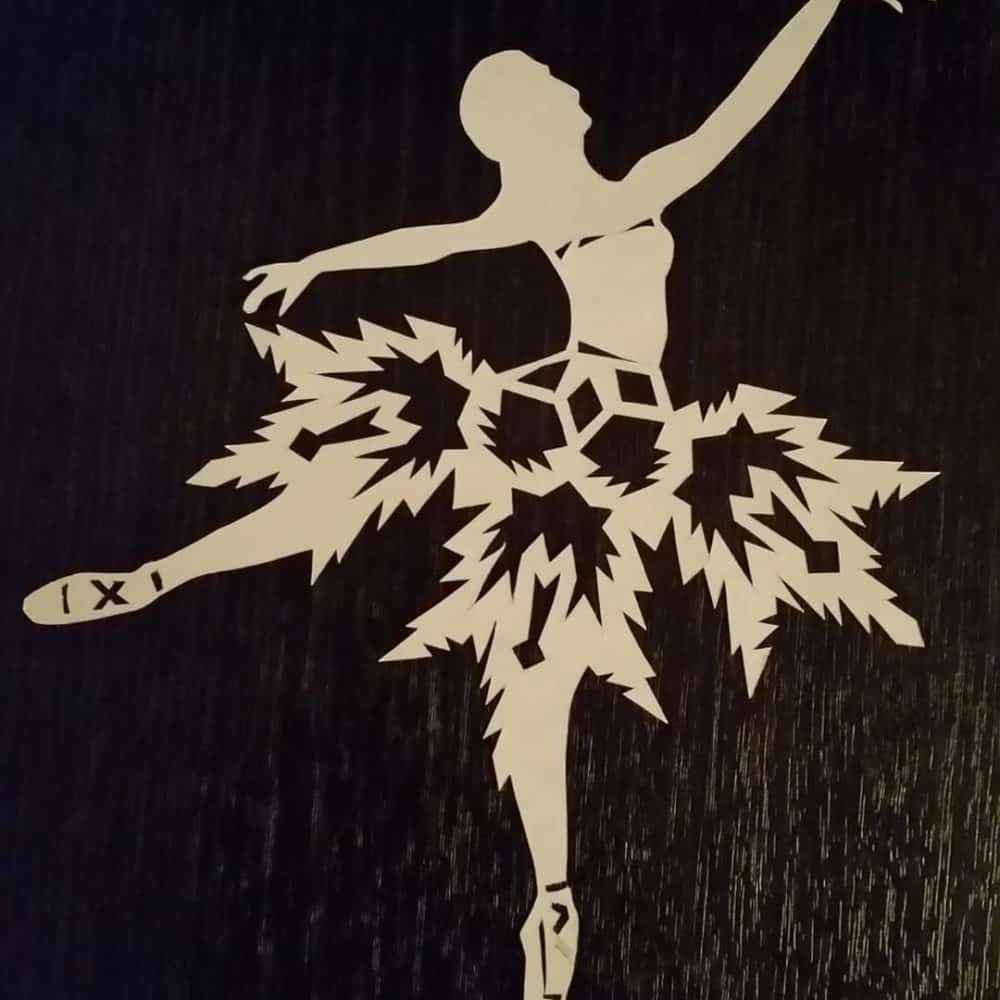 Вырезая балерину в технике вытынанка, лучше использовать не ножницы, а острый канцелярский резак. Им можно сделать самые тонкие или сложные прорези без образования заусенец. Начинают работу с прорезания внутренних выемок ажура. Наружный контур фигуры вырезают в самом конце.