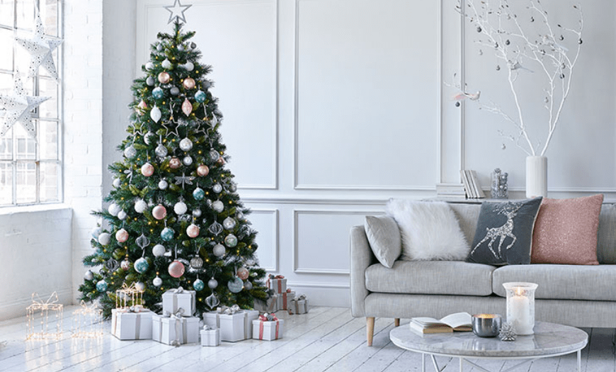 - Прикрепить на конус в хаотичном порядке елочные игрушки. Это легко сделать при помощи двустороннего скотча.