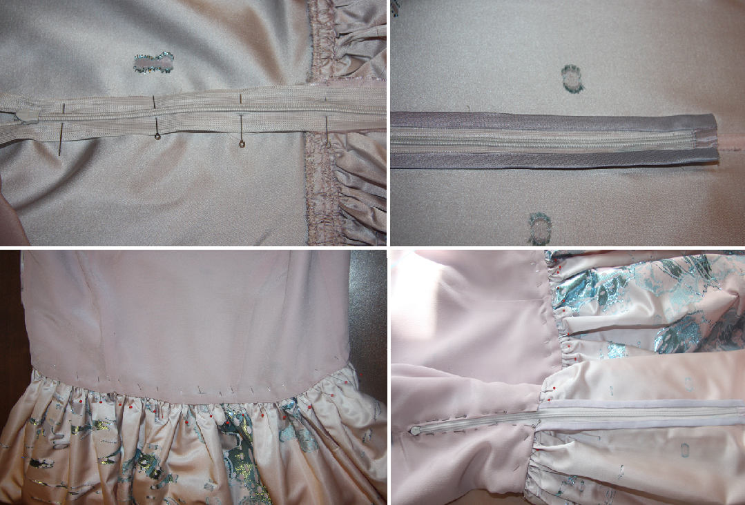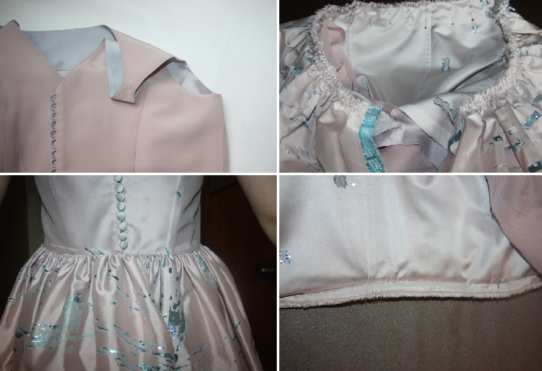 Спинку декорируем навес.птельками и декор.пуговками как на фото. Плечевые швы выполняем только после того, как вы вшили в лиф подклад. Затем лиф соединяем с юбкой иголками и сшиваем намет.швом. Затем на машинке проложить две фиксир.строчки. Вшить молнию в левый бок. Обрабатываем подол платья. Если необходимо то из фатина по той же технологии сшейте двух или трехслойную пышную юбку, под платье. Последний штрих — поясок.
