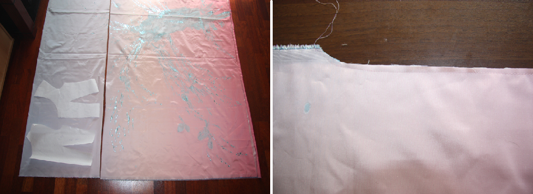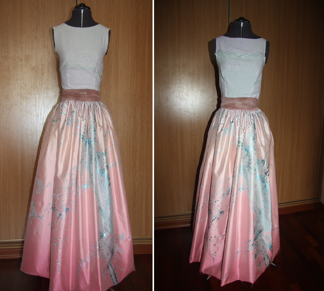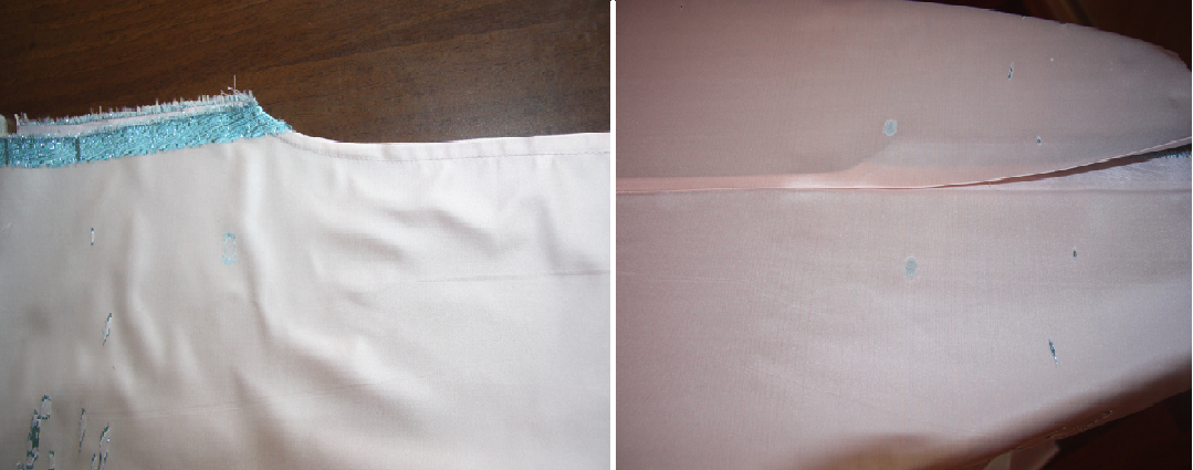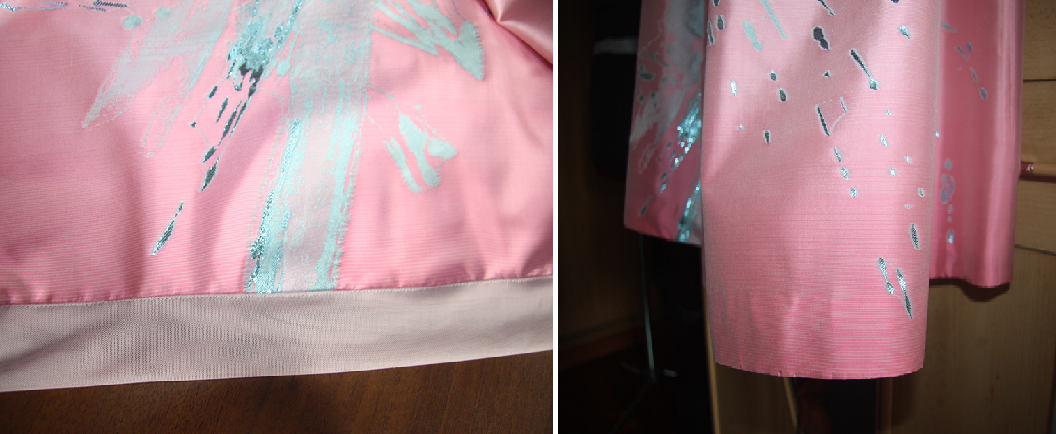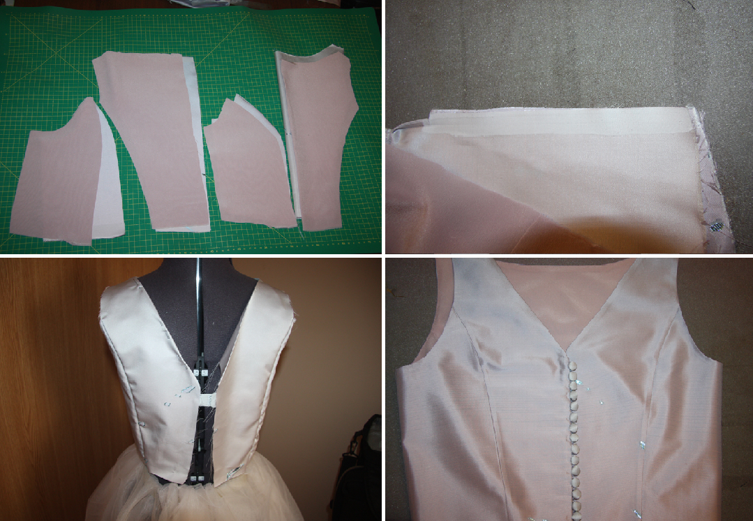 Лиф сначала кроим на другой ненужной ткани, делаем макет и выбираем тот, который лучше смотрится с юбкой. После того, как вы определились, кроим детали уже на шелке и подкладе. Все припуски обработать клеевой. Сшиваем детали по швам, с левого бока стачиваем только на пять сантиметров, там будет вшиваться застежка.