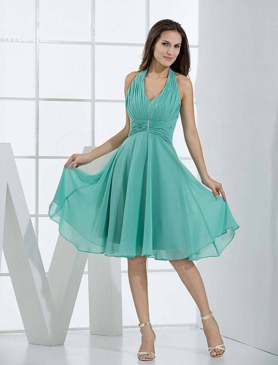 | Шифоновое коктейльное платье. Длина должна быть до колен или чуть выше. На некоторых свадьбах предпочтение отдаете длинным моделям. Лиф имеет не бретельки, а петлю на шее или американскую пройму. Такой вариант выгодно подчеркнет красивые плечи и руки. |