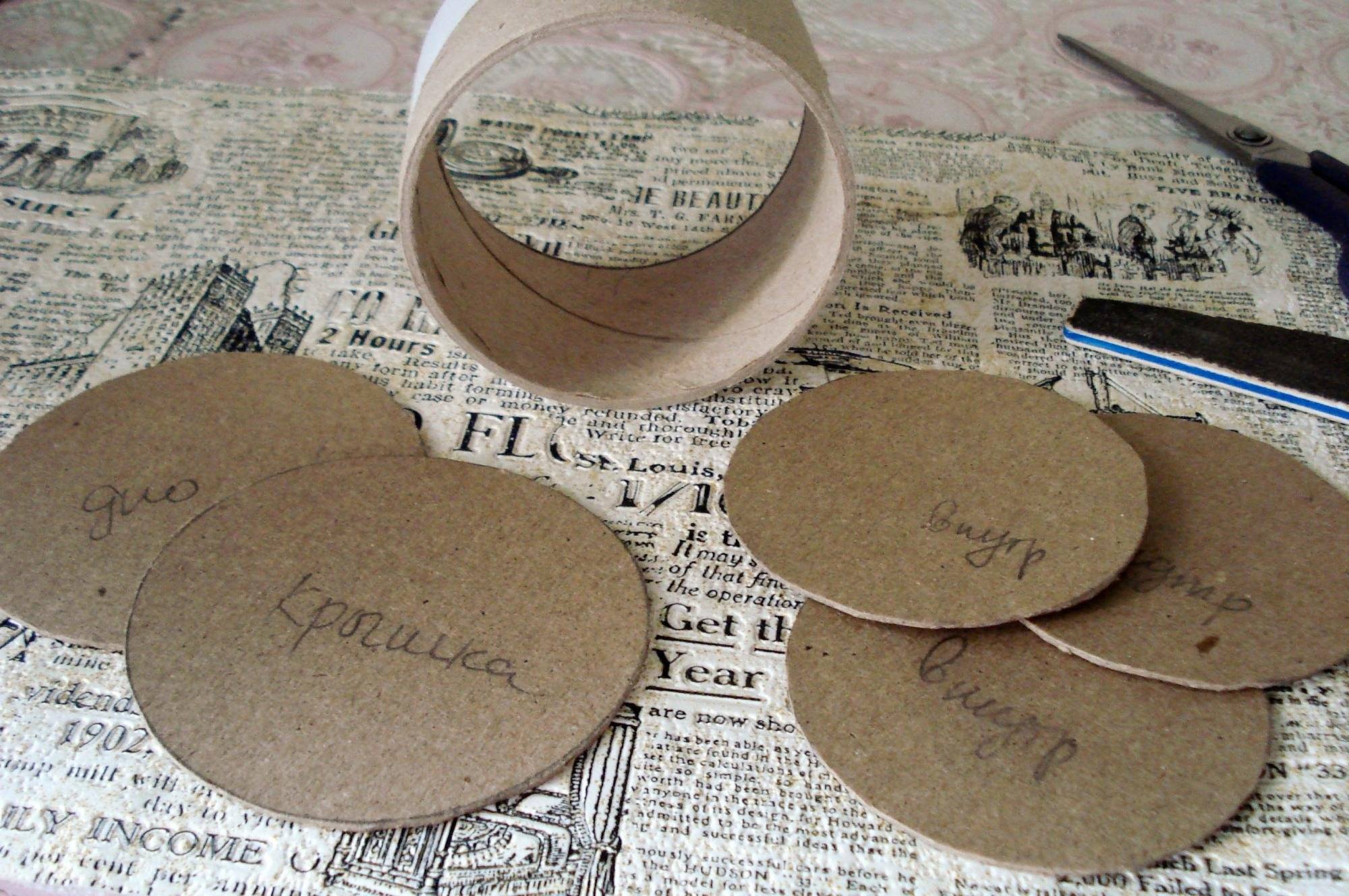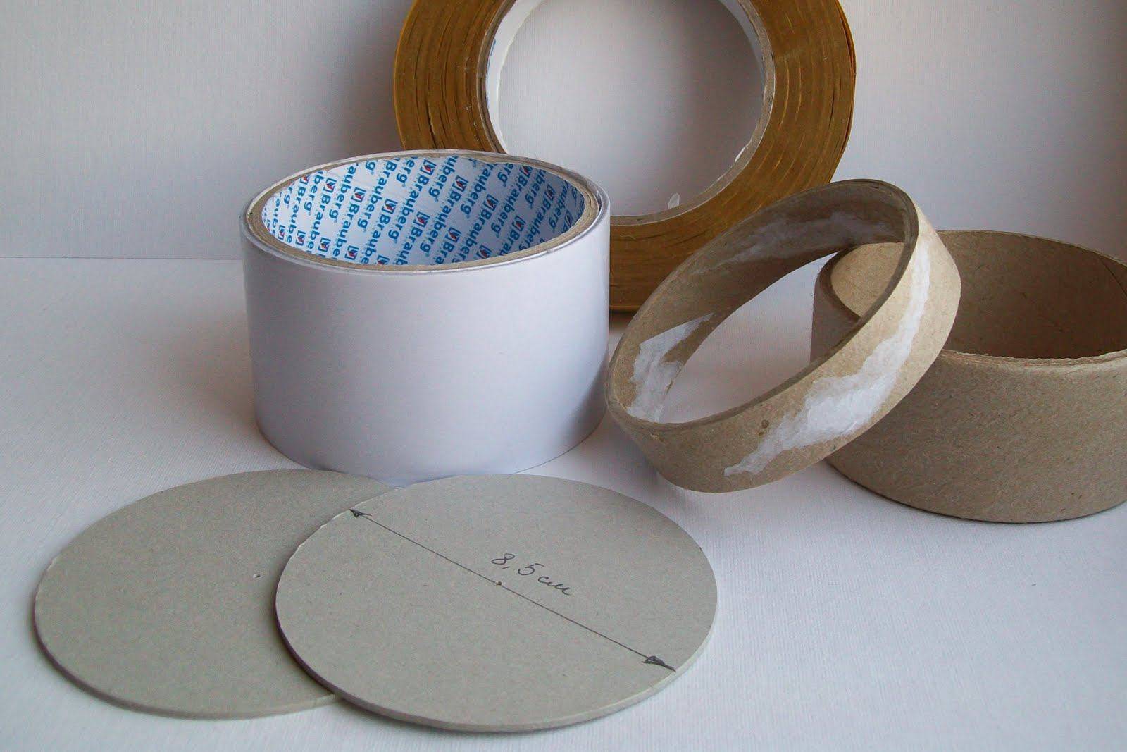 - Приклейте 1 круг к бобине скотча в качестве дна.