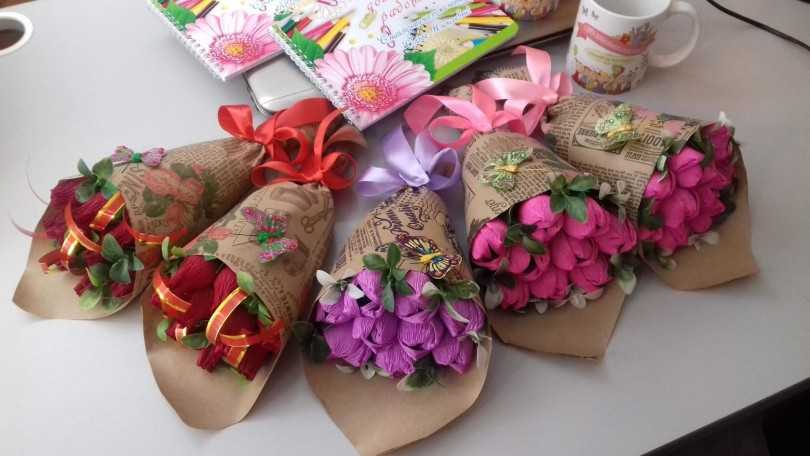 Вам понадобится: гофрированная бумага любимых цветов для бутонов, зелёная гофрированная бумага для листьев, конфетки рафаэлло, двухсторонний тонкий скотч, зелёная тейп-лента, атласная лента, упаковочный материал для букета, ножницы, проволока, пассатижи, деревянная палочка, по желанию для создания росы – прозрачные бусинки, клеевой пистолет, пинцет.
