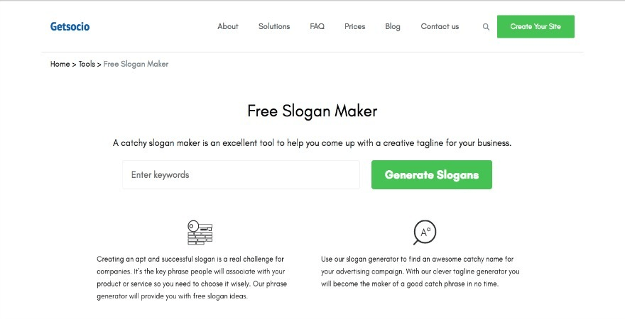 Getsocio — это платформа социальной коммерции для розничных магазинов-дискаунтеров. Платформа разработала очень удобный генератор слоганов, схема работы которого напоминает схему работы Shopify. Также сайт предлагает несколько отличных инструментов, которые помогут вам раскачать свой онлайн-бизнес. Используя рандомные шаблоны, Getsocio предложит вам множество интересных фраз на основе введенного вами ключевого слова. Сервис будет предлагать вам по одному слогану, но вы не стесняйтесь и продолжайте нажимать на клавишу “Сгенерировать”, пока не заболит палец.