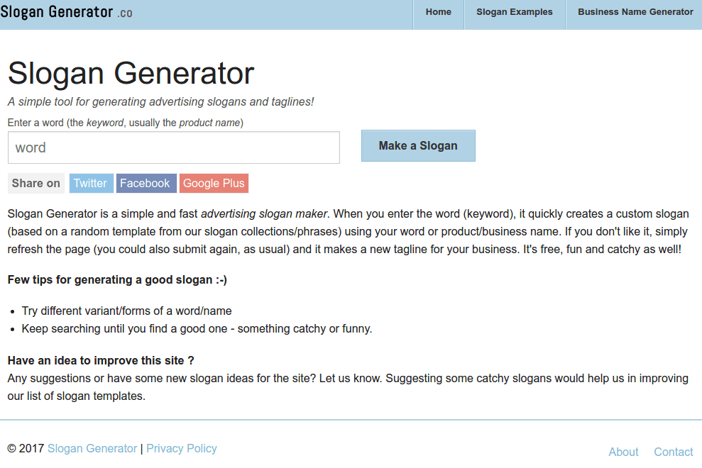 Генератор слоганов на SloganGenerator.co разрабатывался специально с учетом требований рекламных кампаний. Принцип работы этого сервиса стандартный: вы вводите ключевые слова, и система, используя доступные шаблоны, генерирует множество слоганов. Нажимайте на кнопку “Создать слоган”, пока не увидите понравившийся вам вариант. Стараясь идти в ногу со временем, платформа постоянно обновляет свою коллекцию шаблонов и даже прислушивается к советам своих пользователей. Так что здесь у вас есть шанс найти по-настоящему уникальный слоган!