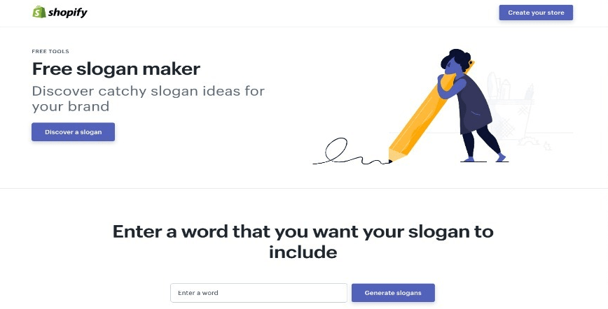 Онлайн-генератор Shopify создает до 1 000 слоганов на основании введенных вами ключевых слов. И все это бесплатно. Это один из лучших сервисов в сети. В то время, как некоторые платформы иногда грешат абсолютно нелепыми вариантами, Shopify использует четкий, хорошо продуманный алгоритм, предлагая креативные, запоминающиеся и интересные идеи. С такими вариантами ваша компания точно не останется незамеченной. Итак, если вы хотите добавить изюминку в свой логотип или запустить революционную маркетинговую компанию, то лучшего помощника, чем Shopify, просто не придумаешь.