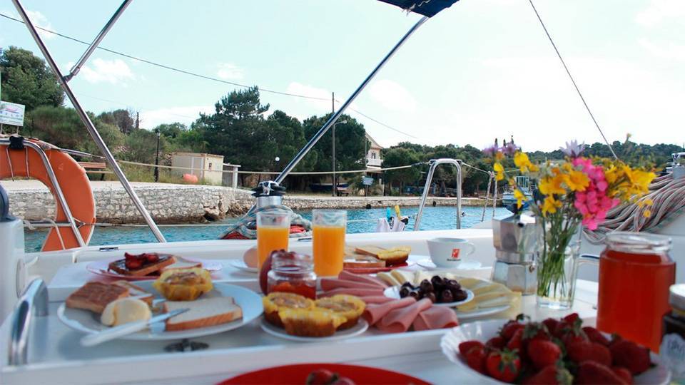 Наутро юнга выяснила, что как раз сегодня (1 октября) ей исполняется ровно 7 с половиной лет. За этим последовало объявление, что раз она нынче именинница, нужен праздник. И мы десантировались на островок. Картошки с собой набрали и заготовок для «брусчетта» – так итальянцы называют поджаренный хлеб со всякой мелко нарубленной вкусностью. Мы с девочками поплыли вплавь, а капитан отвечал за доставку шлюпки с провиантом, зонтами, подстилками, камерой и шляпой.