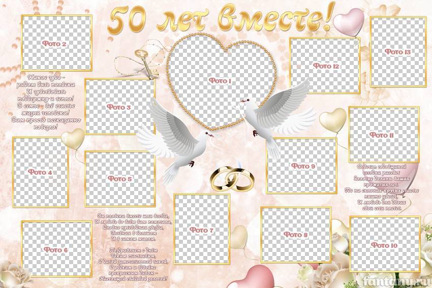 Фотографии мужа и жены будут размещены в рамочках и сердечках на нежно-розовом фоне с цветами и кораллами. Добавьте на плакат лучшие фотографи.