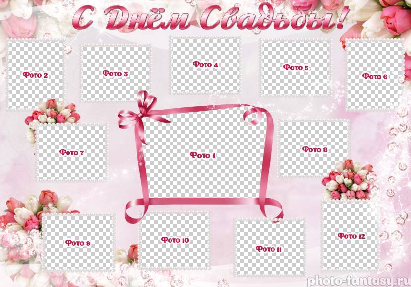 Фотографии будут размещены в крупных рамочках на нежном фоне, украшенном розами и сердцами. Добавьте на плакат лучшие фотографии с момента знакомства, фото со свадьб.
