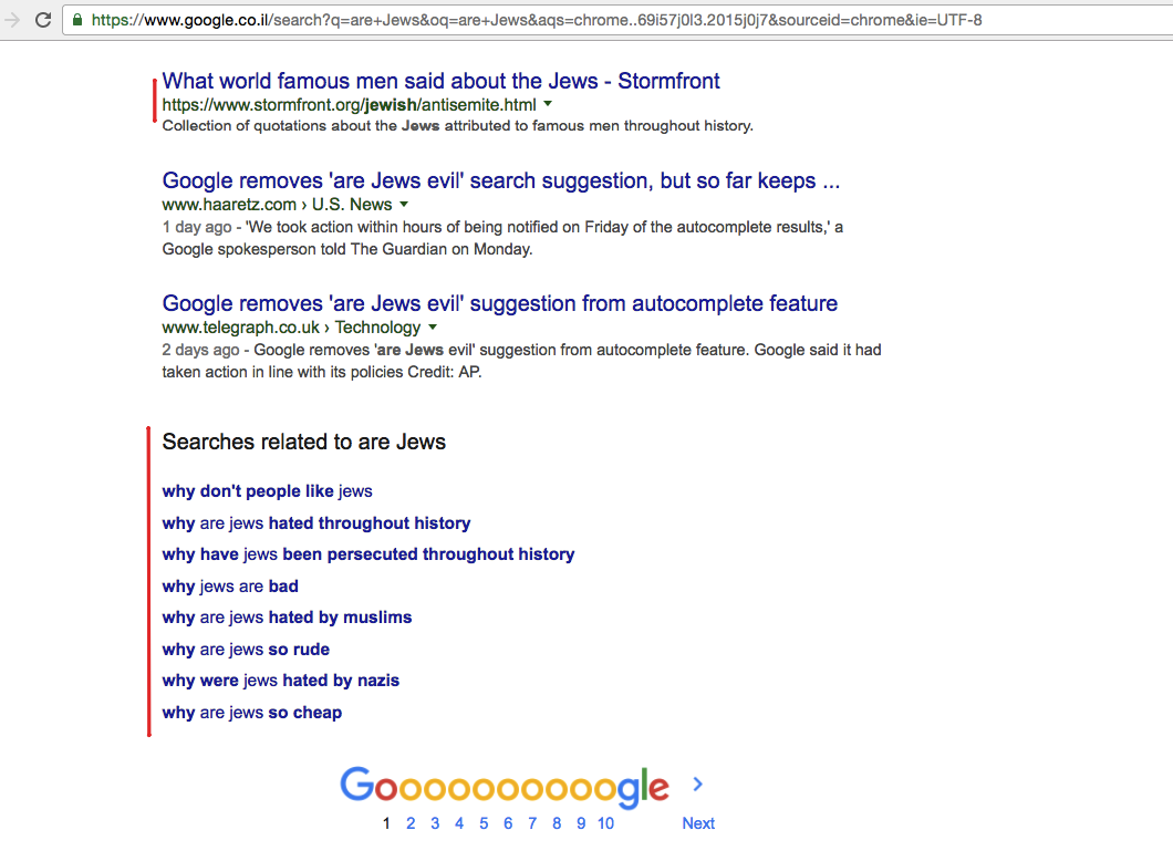 Кстати, не только евреи могут жаловаться на Google. Аналогичные автоподсказки поисковик предлагает также к словам «женщины» и «мусульмане». И это далеко не первый случай – в мае 2015 года разгорелся скандал из-за того, что по запросу «дом негра» в Google Maps отображался Белый дом, а в июле 2015 года было обнаружено, что фотографии двух чёрных подростков были помечены в системе словом «горилла».