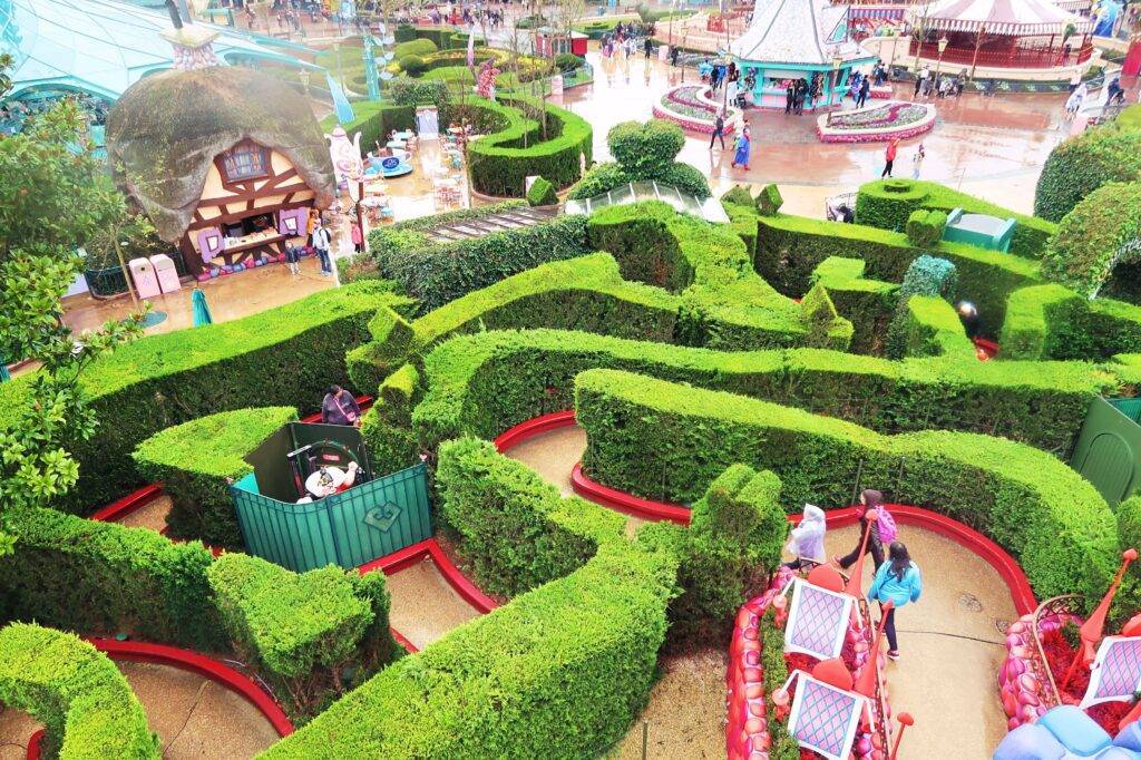 -Погулять и сделать красивые семейные фотографии можно в «Alice’s Curious Labyrinth» – (Лабиринте Алисы). Выход из лабиринта придется поискать, он не находится быстро. Нужно подумать и отыскать заветный выход. Детские аттракционы в этом районе самые разные. На них дети могут кататься сами. Взрослые в этот момент могут постоять в очереди на экстремальные аттракционы. Они представлены такими видами: