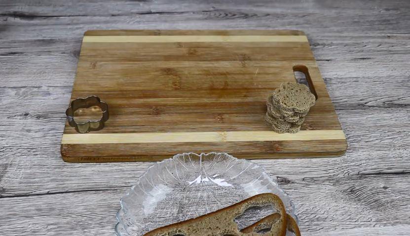 - Хлеб нарежьте наискосок кусками эллиптической формы. Оптимальная толщина каждого куска – 7–8 мм.