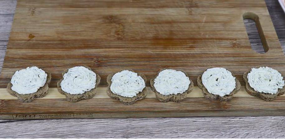 - Когда хлеб остынет, покройте его плотным слоем сливочного сыра.