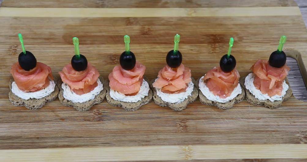 Если хочется внести разнообразие в новогоднее меню, следует поставить на стол канапе с соленой красной рыбой и пикантными дольками лимона. Простую закуску можно приготовить за 5 минут, если все составляющие для нее нарезаны заранее. Выглядят бутерброды ярко, но они отличаются отменным вкусом и повышенной сочностью.