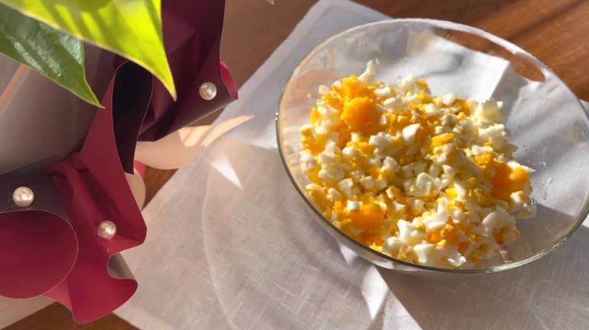 Измельчите кубиками копченую колбасу, твердый сыр. Переложите в глубокую чашу продукты
