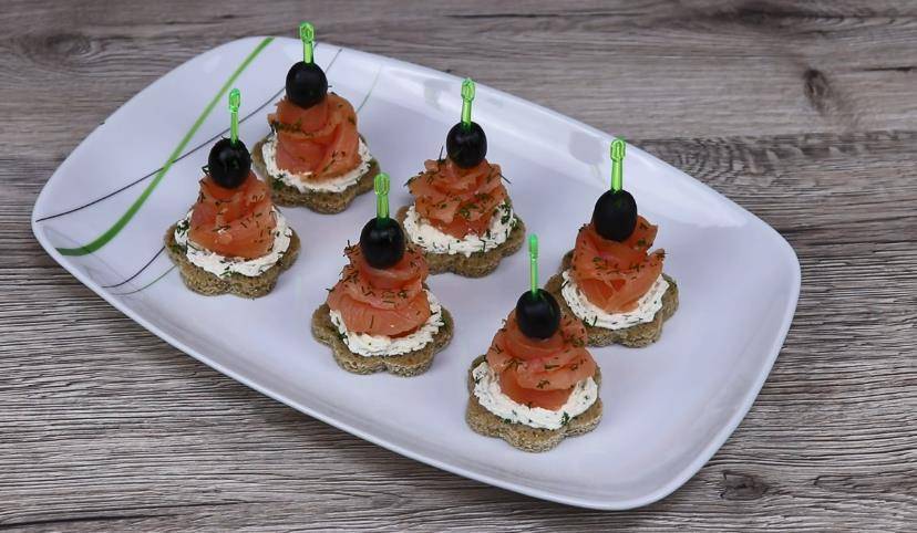 С новогоднего стола маленькие канапе разлетаются за несколько минут, потому что они легко помещаются в рот целиком. На празднике они выделяются многоэтажностью и роскошным декорированием. Канапе с красной рыбой фиксируется при помощи разноцветных шпажек, поэтому их можно употреблять в пищу, не снимая с фиксатора.