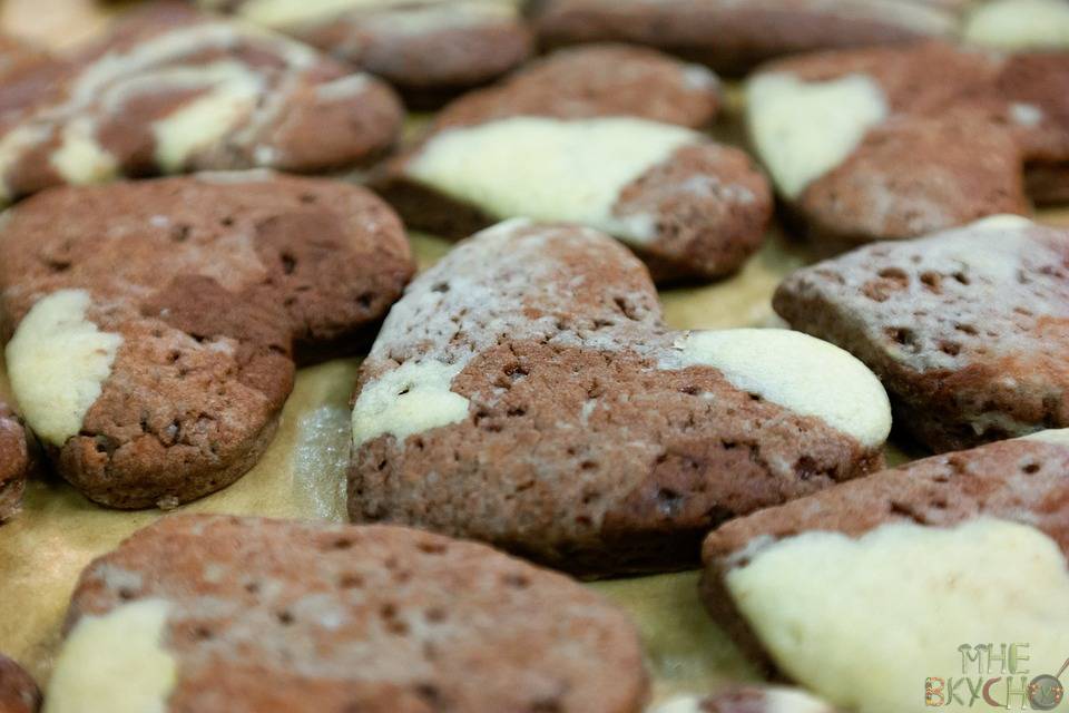 - Остатки теста также по новой раскатываем в пласт и вырезаем новые сердца, пока тесто не закончится. Разогреваем духовку до 180 °C. Пуговки выкладываем на противень, где уже выстелена калька для выпечки и ставим в духовку выпекать. Выпекаем примерно 20 минут.