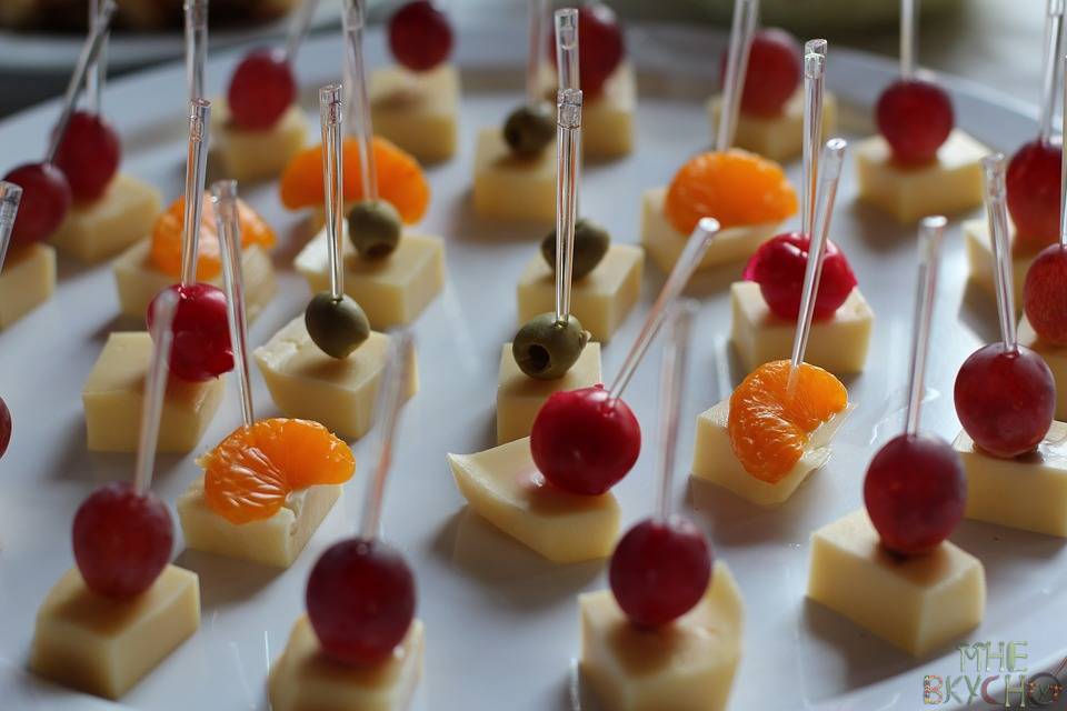 Этот рецепт канапе из двух ингредиентов еще проще. Для этого нарезаем небольшими кусочками сыр и сверху кладем либо дольку мандарина, либо оливку или виноградину.