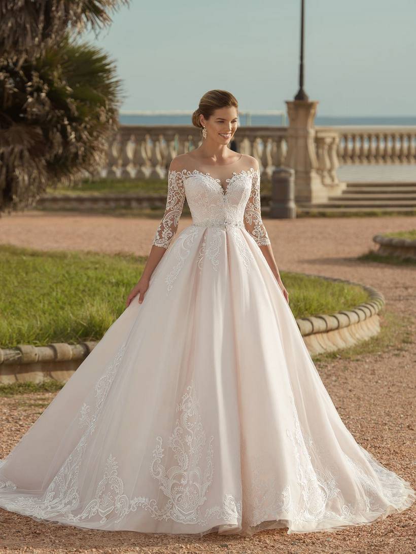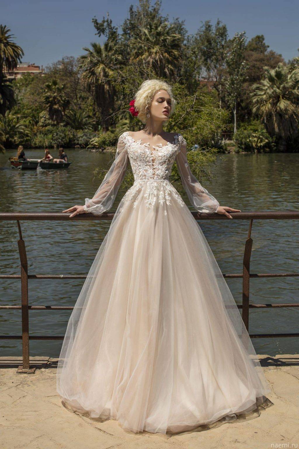 Пышная юбка, незатейливый лиф, ажурные рукава шикарного платья в розовом тоне достойны принцессы. Корсет в форме сердца дополнен прозрачной горловиной, которая плавно переходит в ажурные рукава. Юбка из фатина украшена складками в виде бантов, по краю и шлейфу проходят аппликации из атласа.
