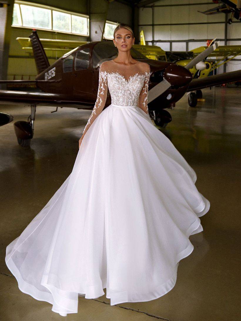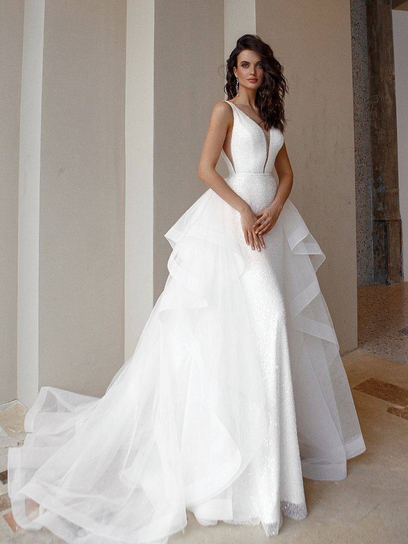 Самой популярной тенденцией сезона 2019 2020 года стало платье, лиф которого выполнен из кружева, а юбка из нескольких слоев легкой ткани. За счет многослойности, юбка приобретает пышность и подчеркивает талию невесты. Девушки в таких моделях создают образ романтичности и воздушности. В некоторых моделях подол юбки украшается аппликациями в виде элементов кружева, использованного для пошива лифа платья.