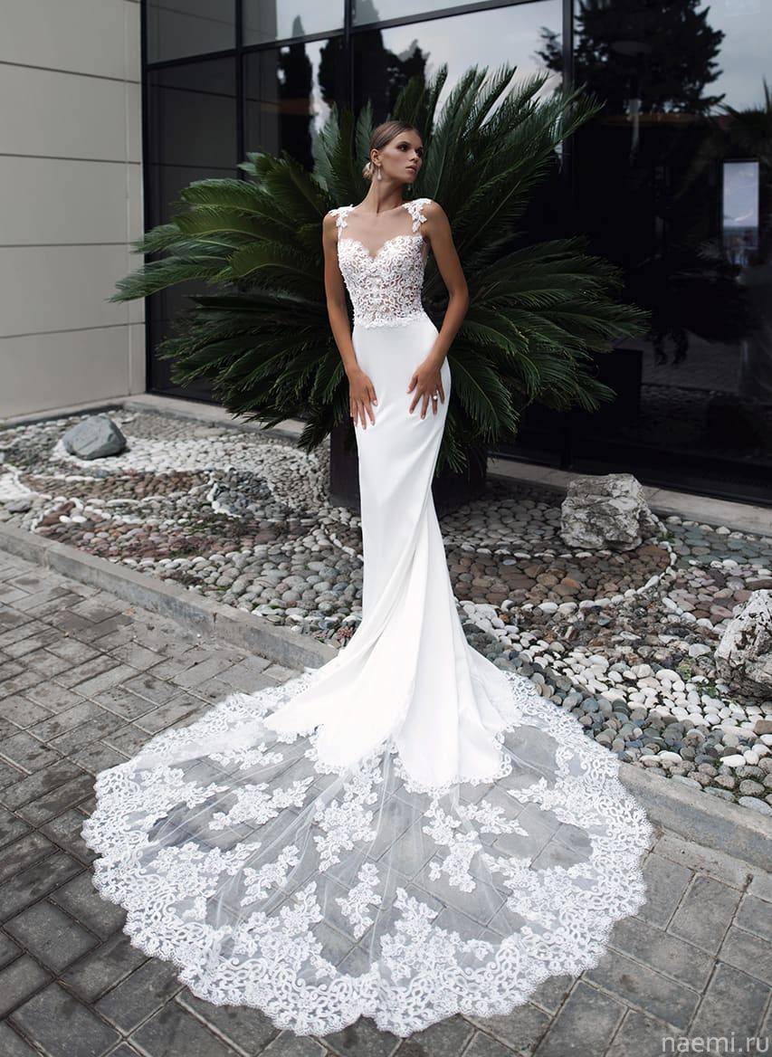 Модные кутюрье воплотили в коллекции 2019 2020 года самые невероятные модели. Непревзойденный крой белоснежного свадебного платья, выполненного из кружева и фатина, обладает особой изысканностью. Наряд представляет собой лиф типа бюстье и прямую юбку в пол со шлицей до колена. Эта часть свадебного туалета изготовлена из кружевной ткани. Дополнительная юбка, сконструированная из нескольких слоев фатина такого же цвета, одевается поверх основного платья и фиксируется лентой, завязанной бантом. Романтичный и чувственный фасон такого свадебного платья смотрится очень современно за счет удачного кроя и комбинации материалов.