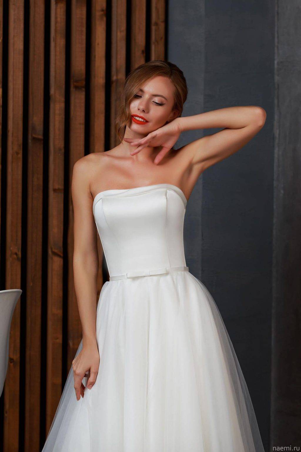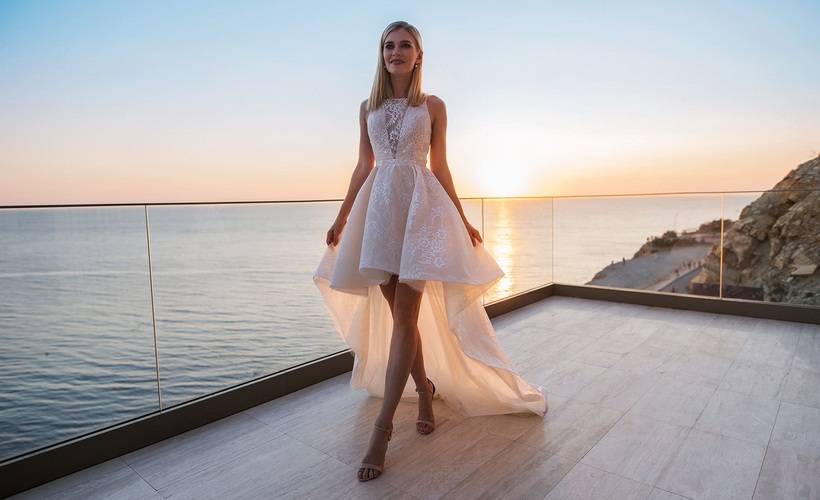 Спереди юбка платья немного не доходит до колен, сзади развивается легкий и прозрачный шлейф. Верх закрыт, модель подчеркивает талию. Юбка украшена складками, искусные кружева — все это создает неповторимый лук.