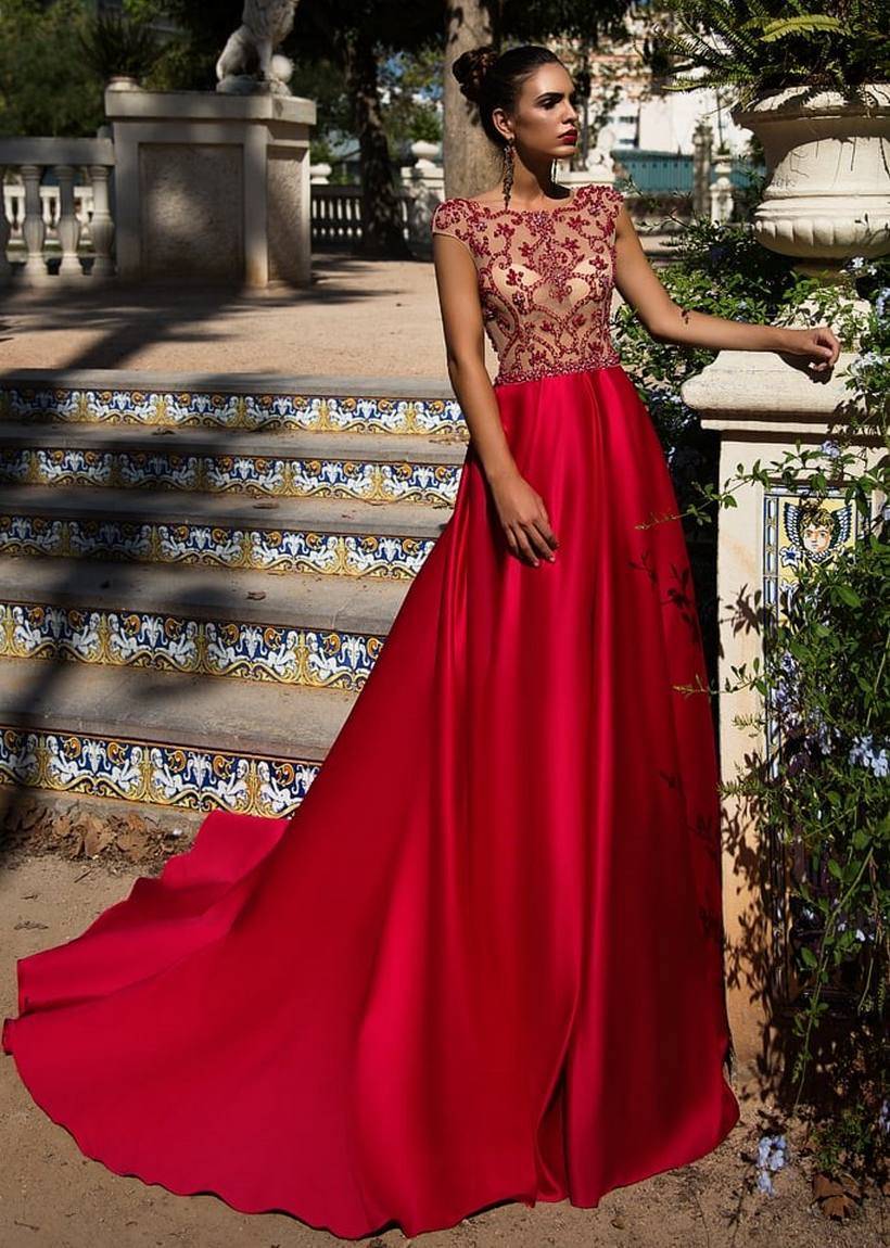 Свадебное платье из красного атласа с алыми и малиновыми переливами — верх совершенства. Подходит чувственным женщинам. Легкий A-силуэт расширяется к низу. Прозрачный лиф выполнен в тон кожи, украшен бисером. Круглое декольте, бретели, закрывающие плечи, врез «лодочка», все элементы удачно гармонируют между собой.