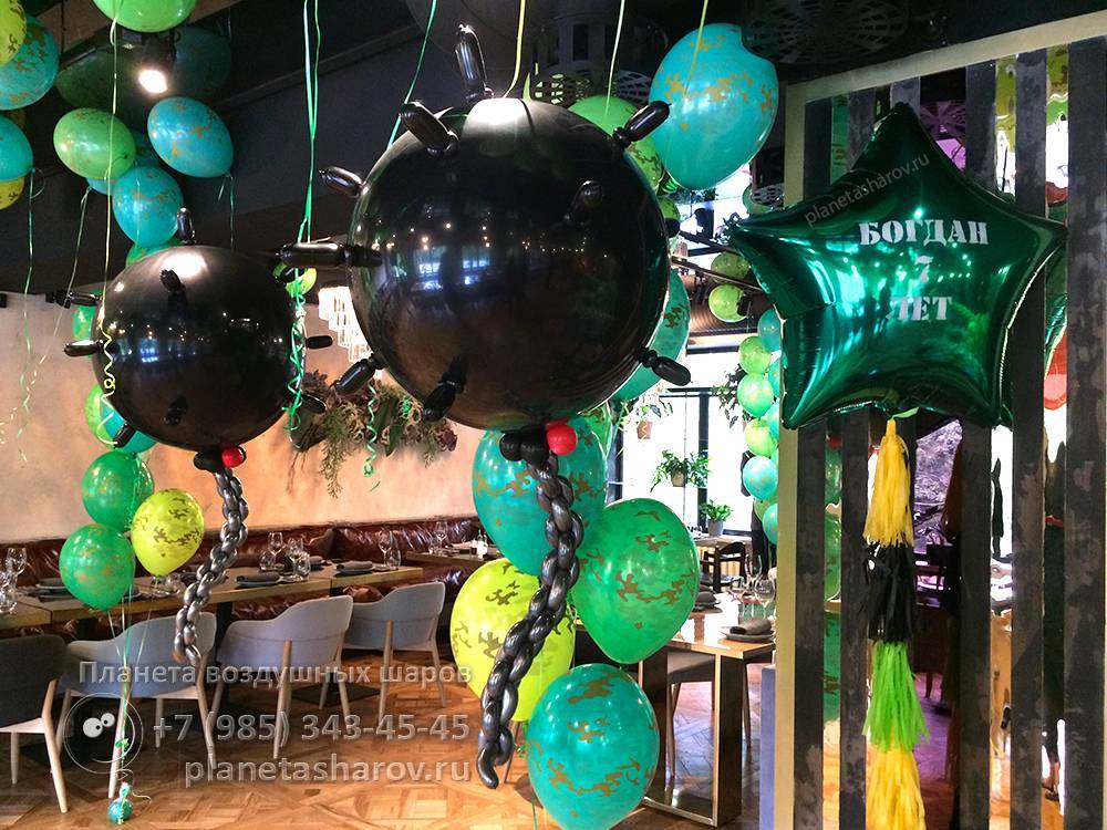 Поможем создать романтическую атмосферу сражений в месте празднования дня рождения ребенка. Характерные для армейской техники и формы солдат цвета призваны замаскировать объекты на местности, потому не отличаются яркостью и красотой. Предлагаем воздушные шарики на день рождения в тематике милитари защитного зелено-серо-коричневого цвета, но более насыщенных оттенков. Будь то зал кафе, игровая комната детского сада или домашняя обстановка – декор в природной гамме камуфляжа отлично вписывается в любой интерьер.