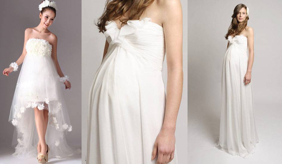 Здесь можно обращать внимание на облегающий лиф, а от корсета следует отказаться. Пышные юбки отвлекут взгляды от округлого животика. Не следует покупать модели, где декор располагается на талии