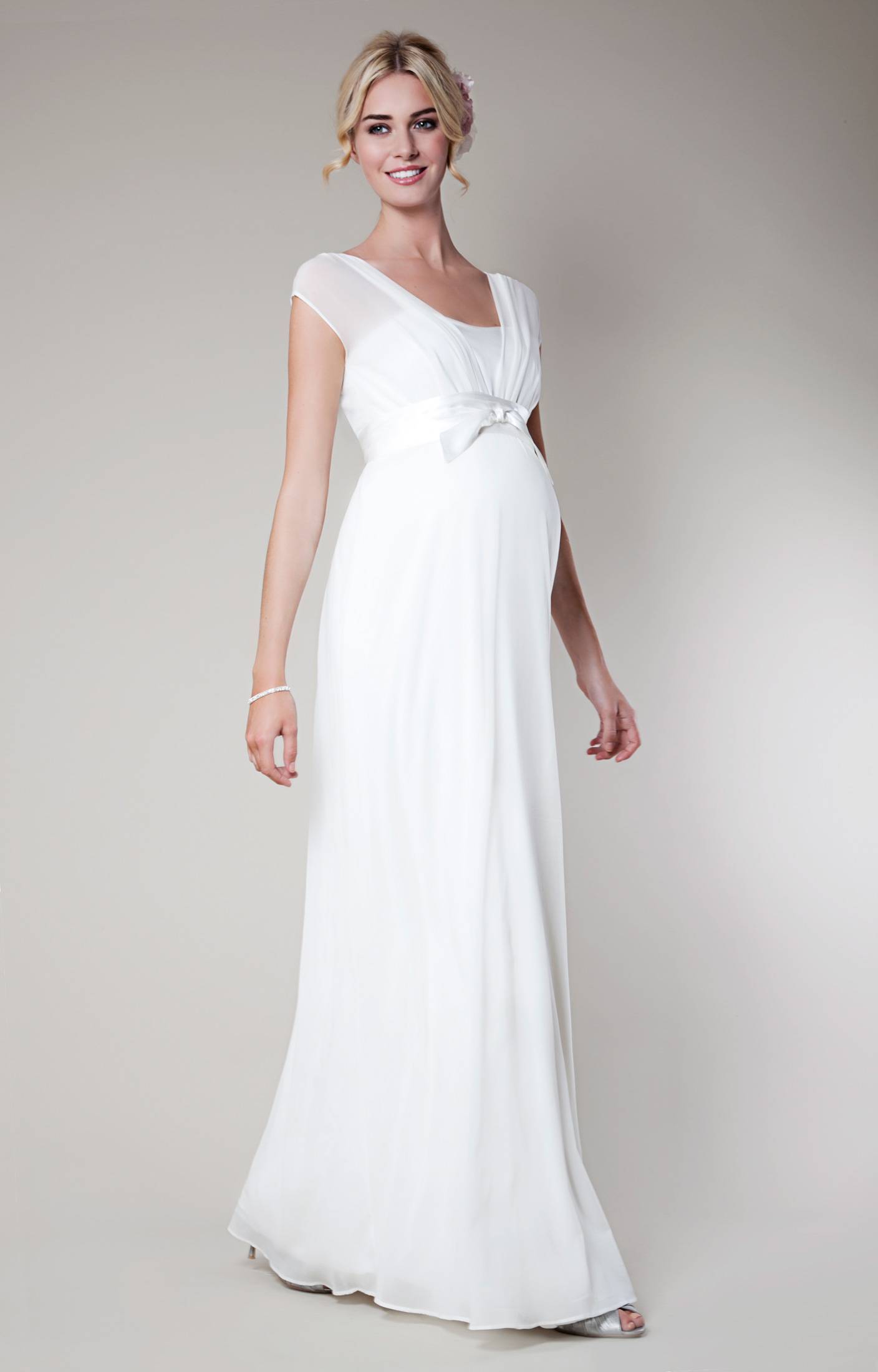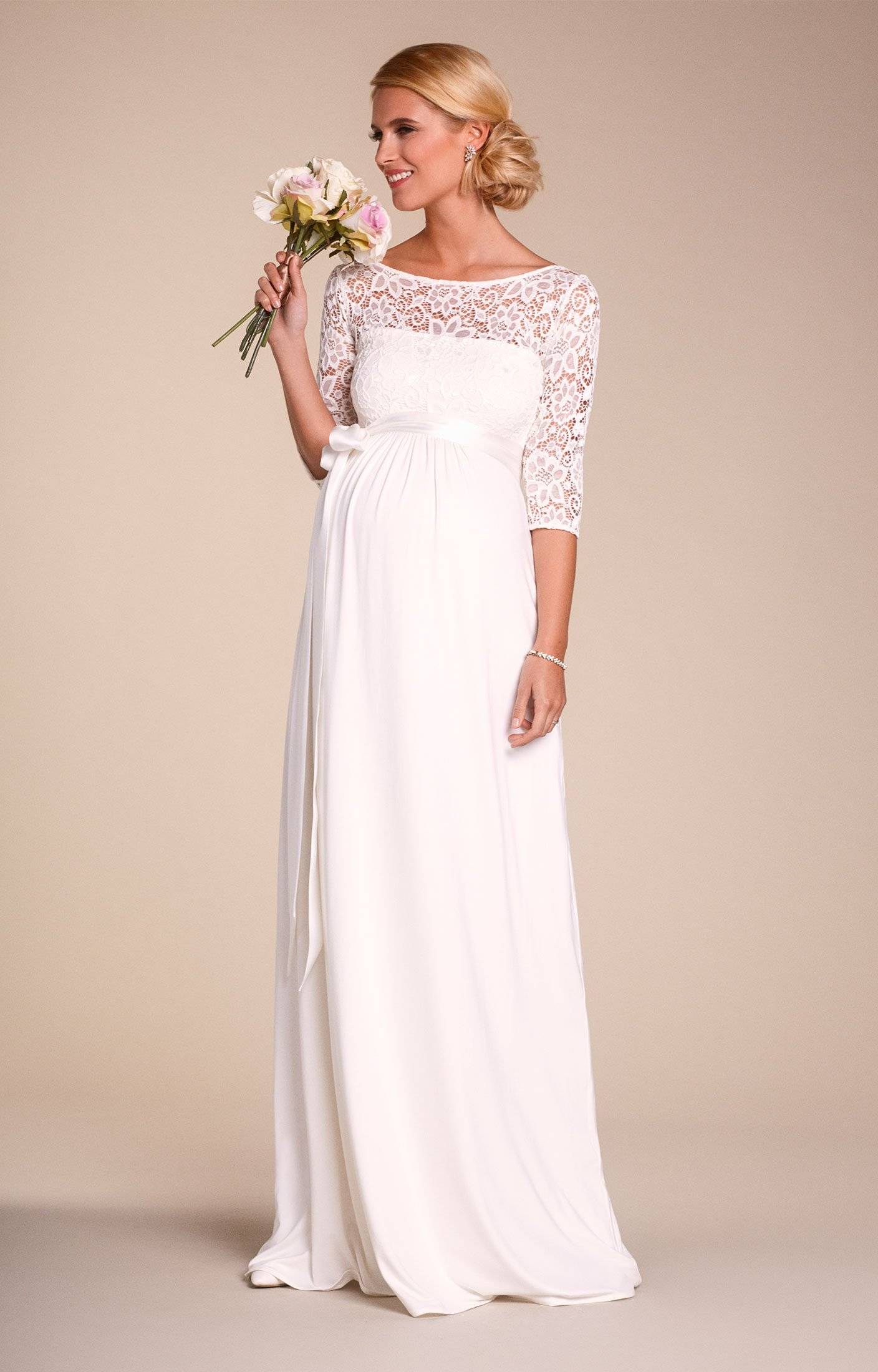 Вечернее одеяние должно подчеркнуть округлившиеся формы невесты. Для этого изделие должно быть украшено шлейфом, драгоценными камнями, ажурными вставками. Если срок беременности небольшой и необходимо спрятать слегка округлую форму живота можно примерять платье с высокой талией и свободным покроем.