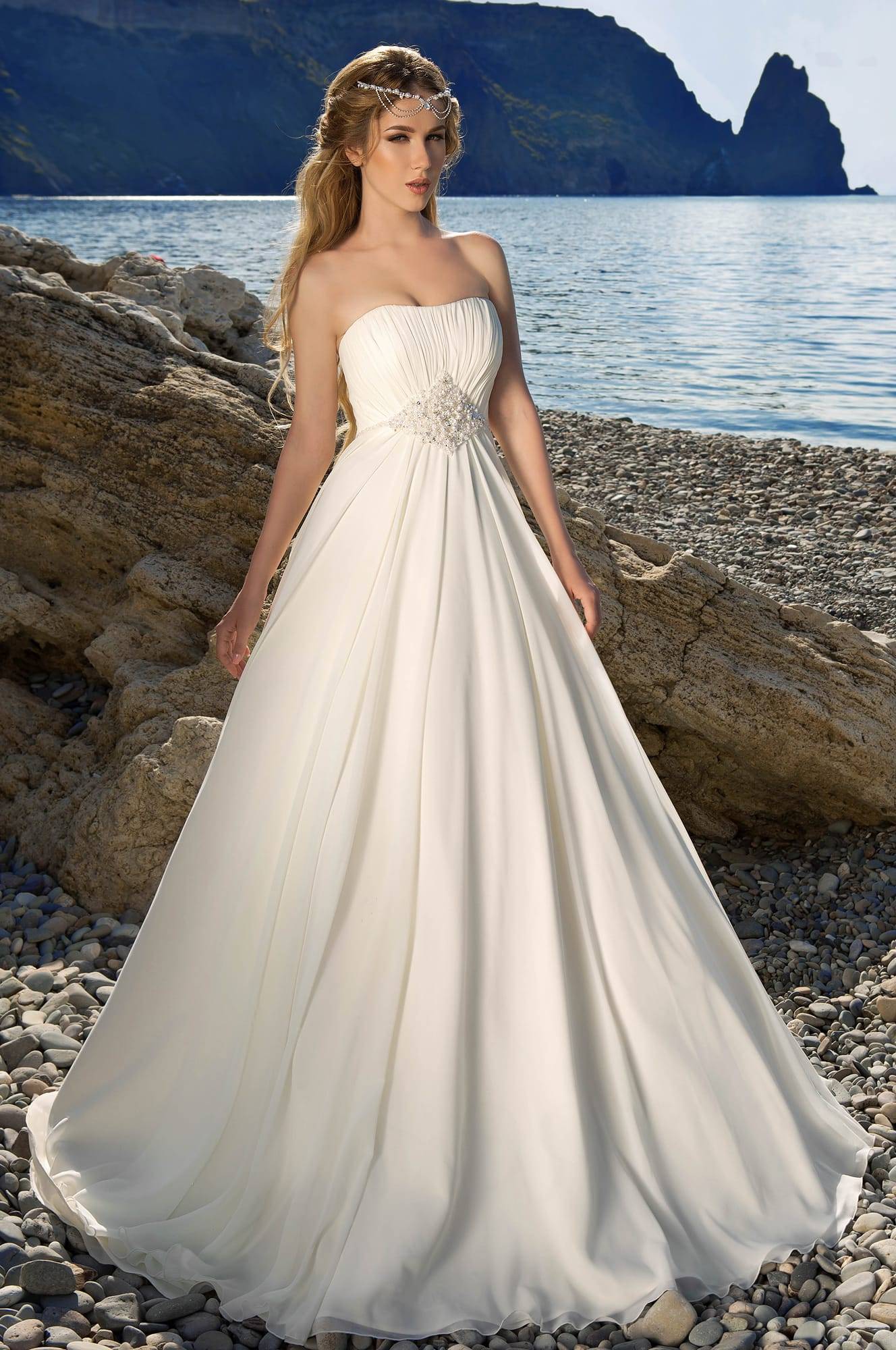 Особенность кроя – акцент на талии отсутствует совсем. Такой стиль может быть максимально простым, напоминающий древнегреческую тунику. Новобрачная сможет делать прическу любой сложности, перенося взгляды на декор или аксессуары.