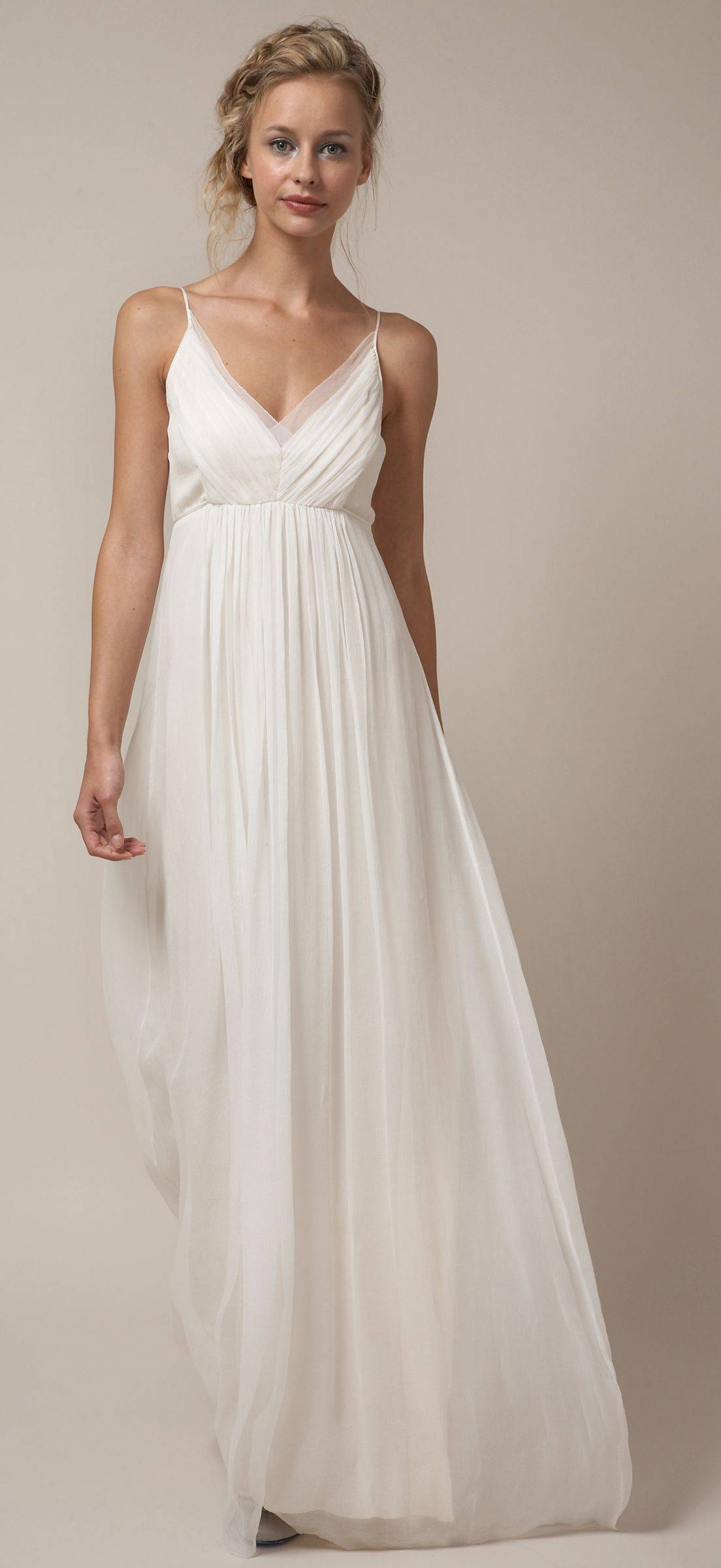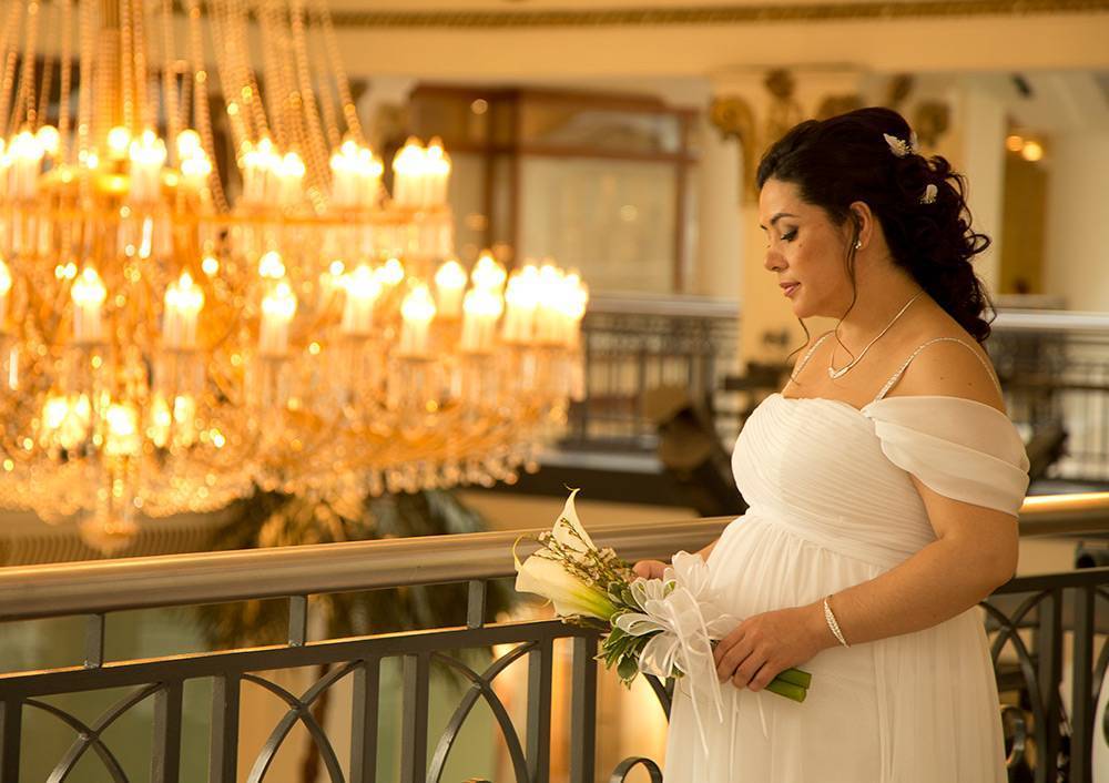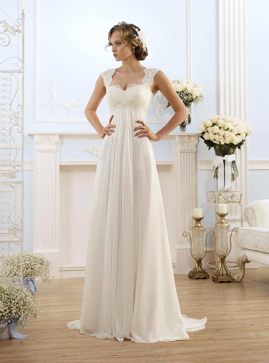 Свадебное женственное платье в греческом стиле для беременных отличается высокой талией, легкими материалами, лифом с глубоким декольте. Особенности тканей создают элегантные складки, драпировку. Увеличение размеров груди можно спрятать под этим платьем, сделав ее главным достоинством фигуры.