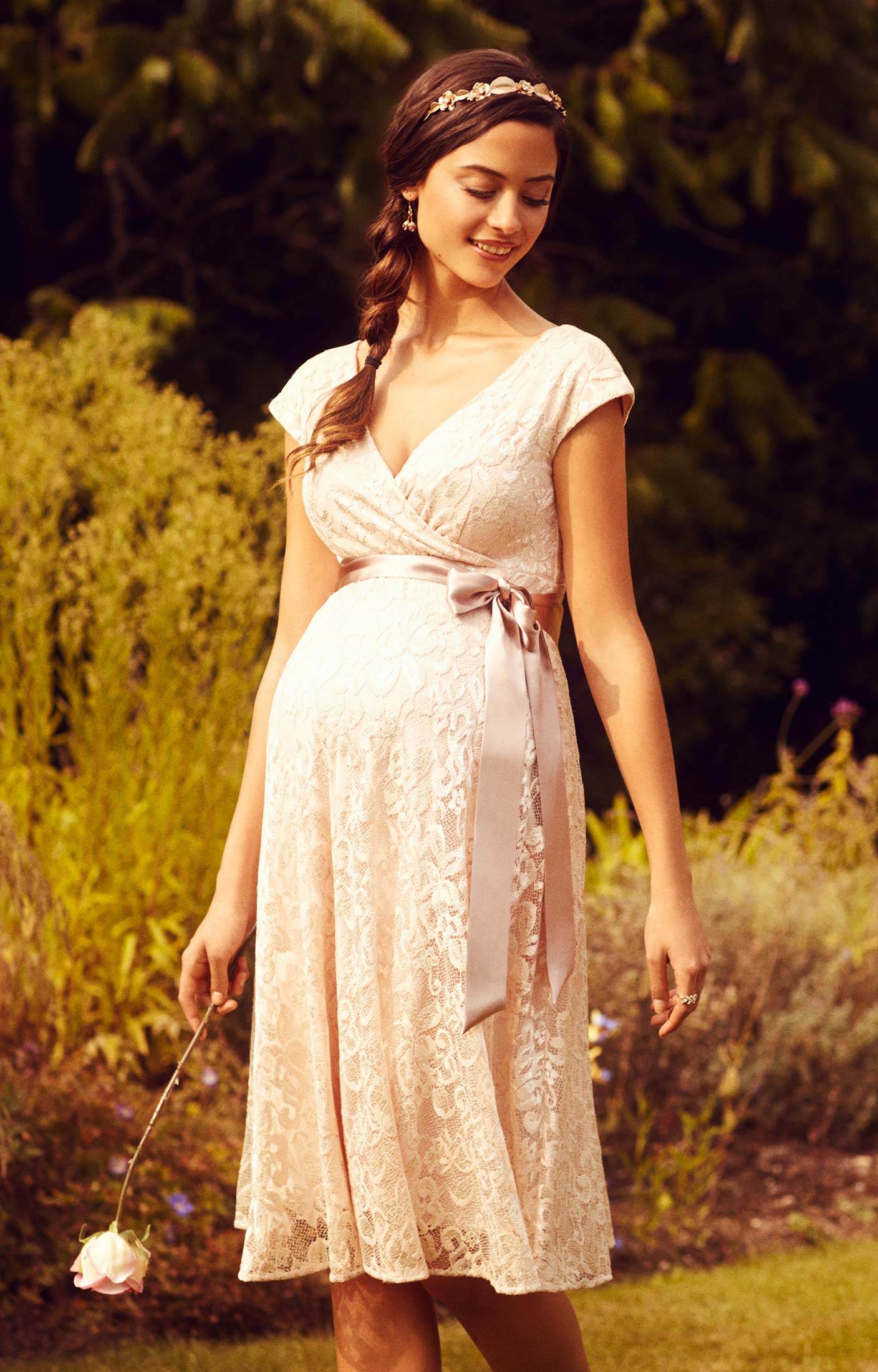 Здесь можно обращать внимание на облегающий лиф, а от корсета следует отказаться. Пышные юбки отвлекут взгляды от округлого животика. Не следует покупать модели, где декор располагается на талии