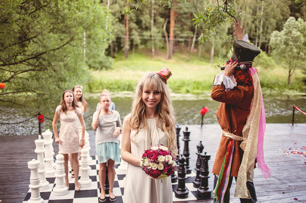Обычный пикник будет слишком скучным для такого торжественного дня. А если сделать из него историю-сказку, то такой праздник станет запоминающимся и ярким. Подготовьте красивые фотозоны. Украсьте дорожки в стиле сказки об Алисе.