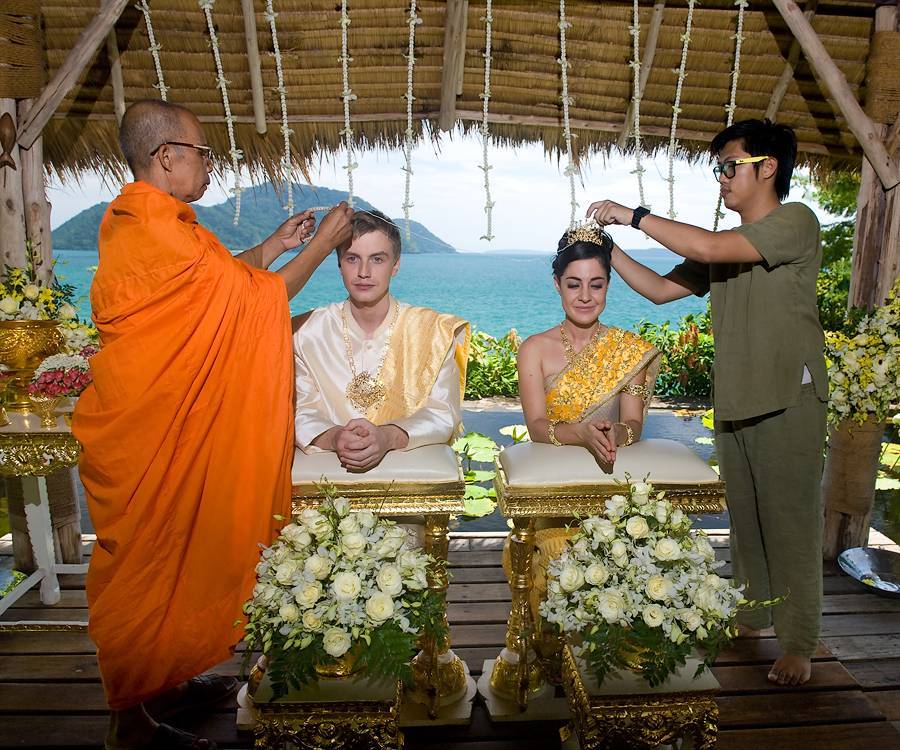 Следующая остановка — буддистский храм. Монахи, одетые в свои шафрановые тоги, благословляя союз, связывают пару самыми настоящими узами брака. Церемония начинается с оглашения монахами пяти основных заповедей буддизма. Далее происходит распевание древних буддистских мантр, во время которых монахи надевают на шеи молодым специальные гирлянды из свежих тропических цветов. Во время церемонии монахи благословляют молодоженов и всех присутствующих святой водой, которая принесет счастье, покой и удачу.