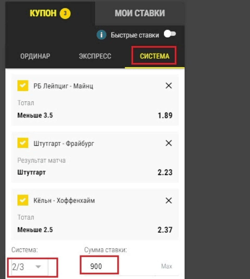 Выбираем три события из линии БК Париматч. Предположим, что мы ставим 900 рублей. Эта сумма разбивается на 3 экспресса (по 300 рублей) в системе 2 из 3.